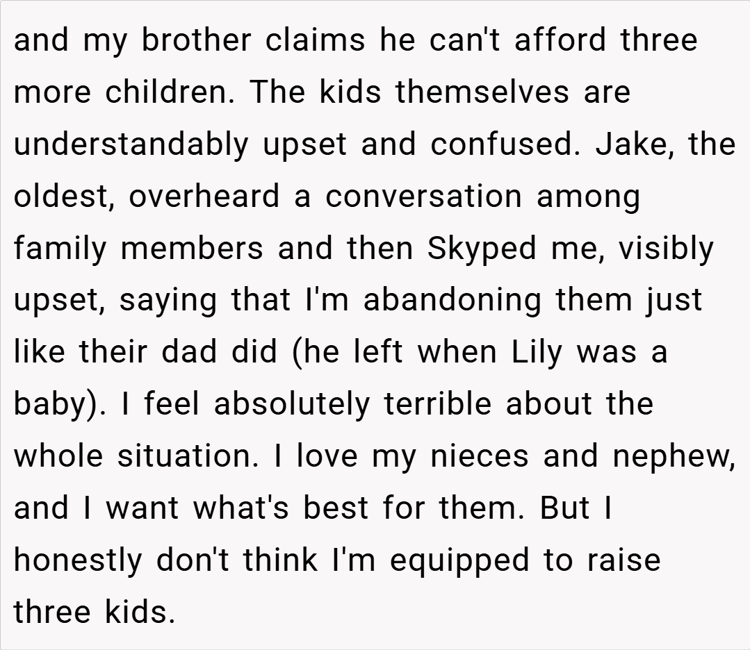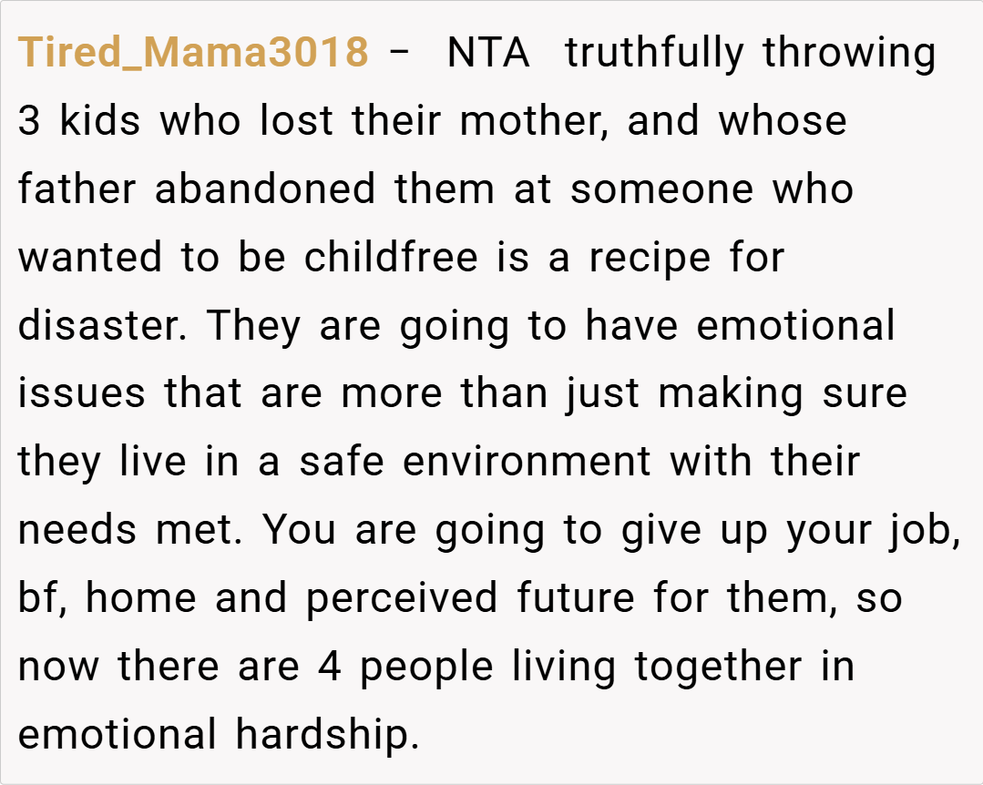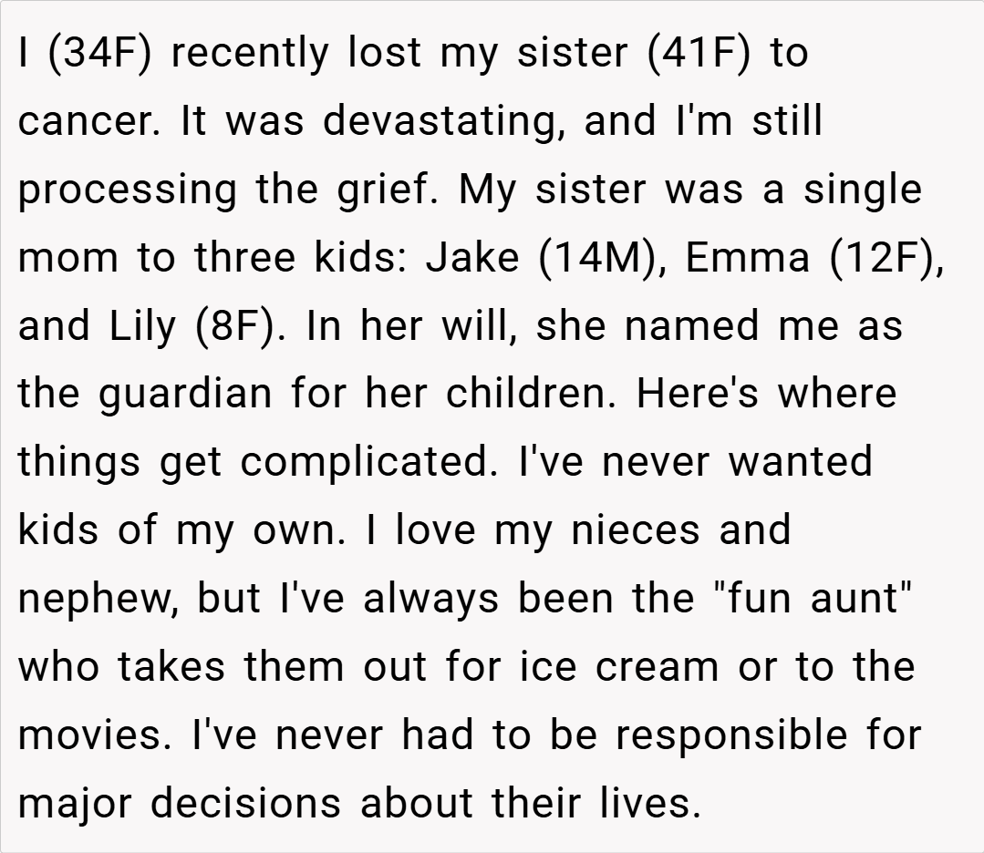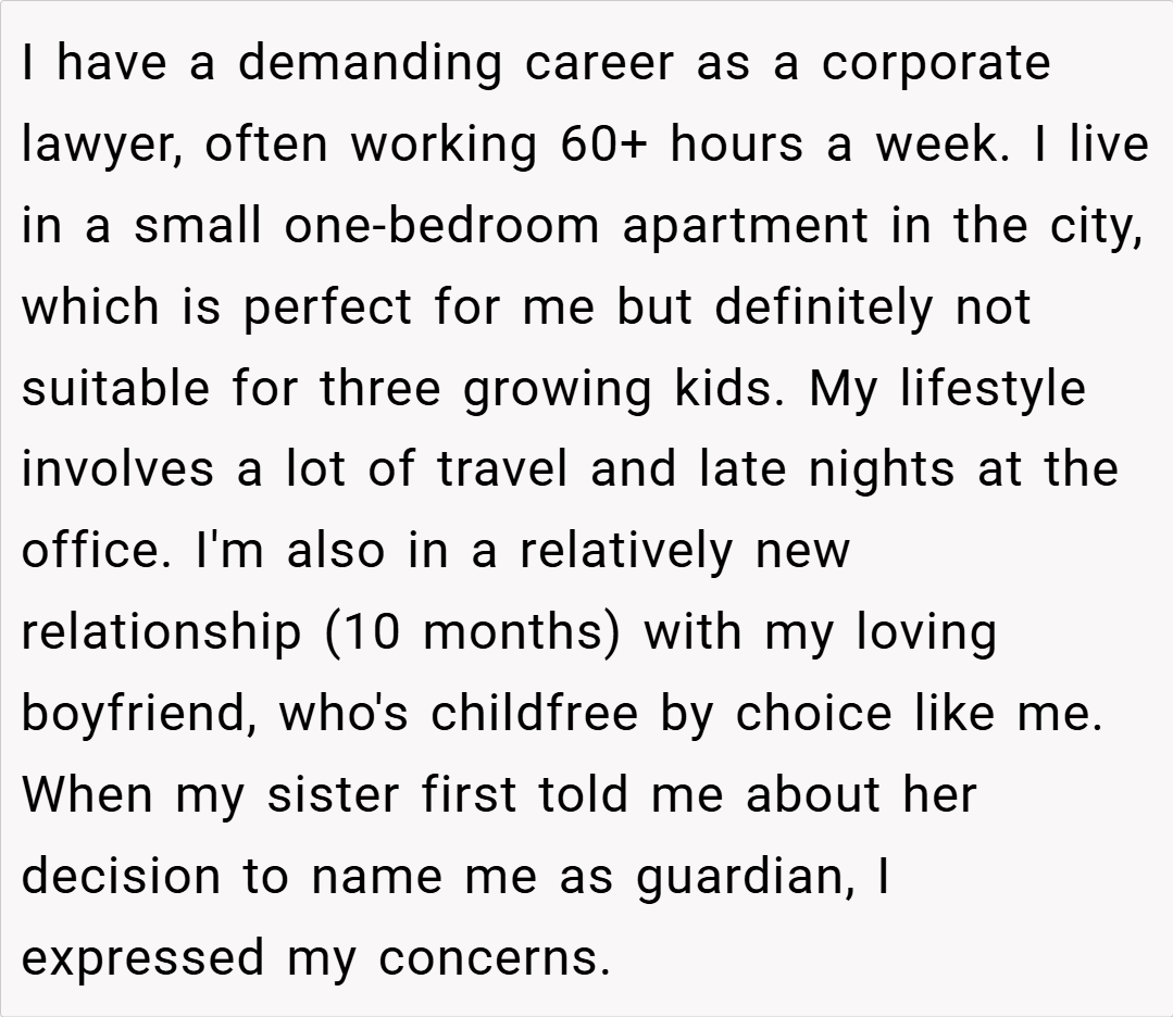 While her sister envisioned that these kids would eventually have a loving home with someone who cared about family legacy,OP has always been the “fun aunt” rather than a full-time caregiver. With a demanding career, a small one-bedroom apartment in the city, and a relatively new relationship with a childfree boyfriend, the prospect of raising three children is overwhelming.