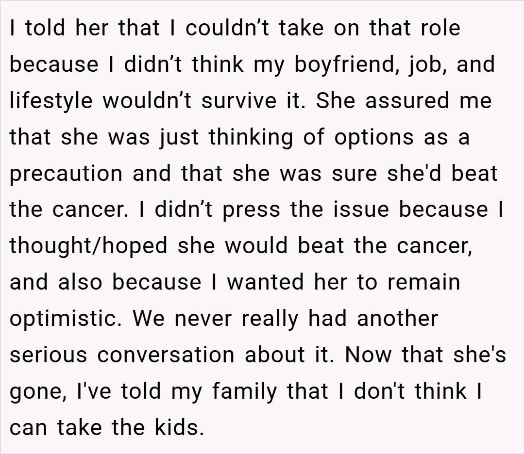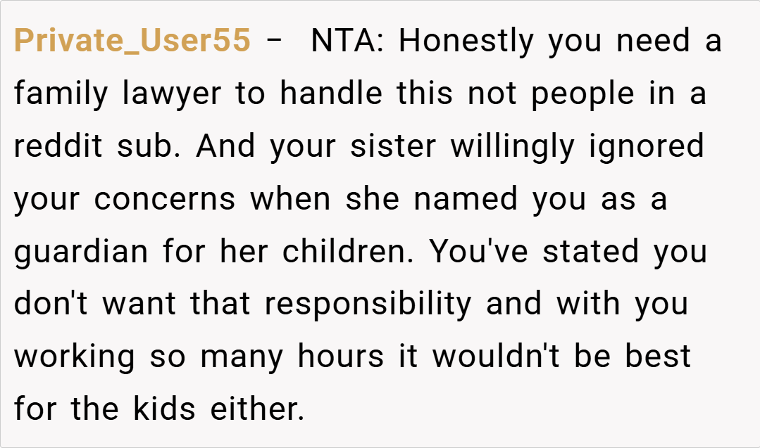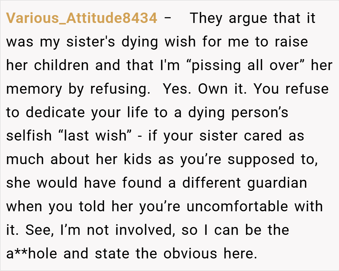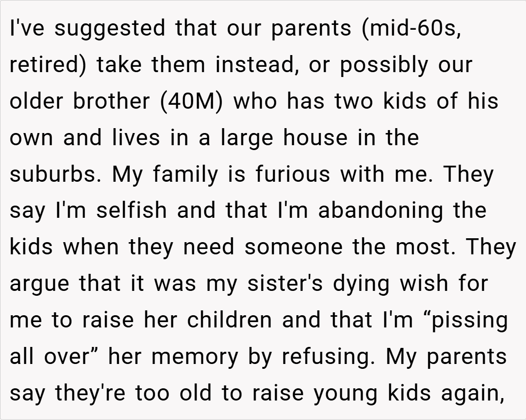 In the end, OP’s refusal to take on the role of guardian for her late sister’s children appears to be a well-considered decision based on her lifestyle, financial responsibilities, and emotional capacity. While her family sees it as a betrayal of her sister’s final wishes, it’s important to recognize that not every family member is equipped to handle such responsibilities. OP’s suggestion that someone else in the family might be better suited is a call for a more balanced approach.