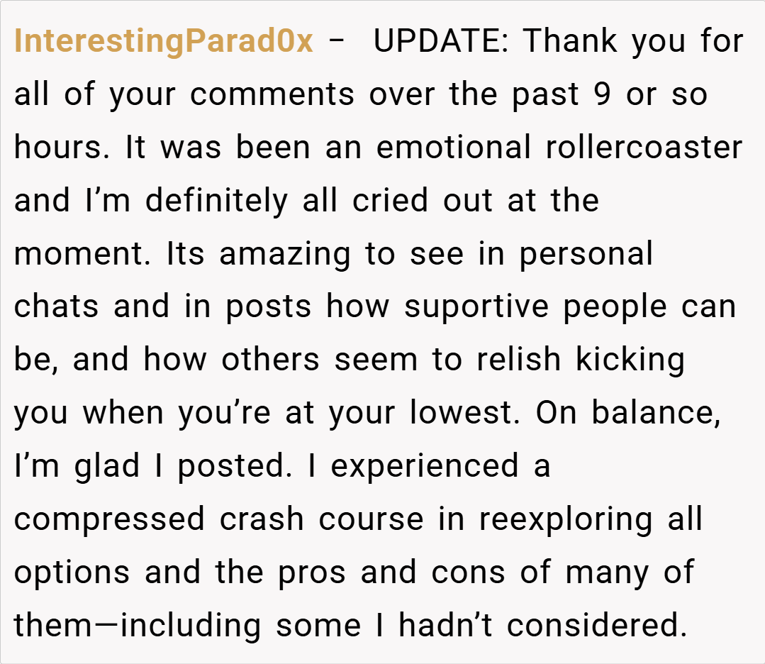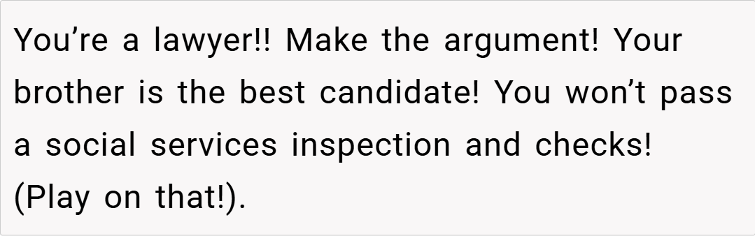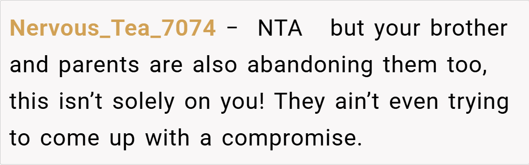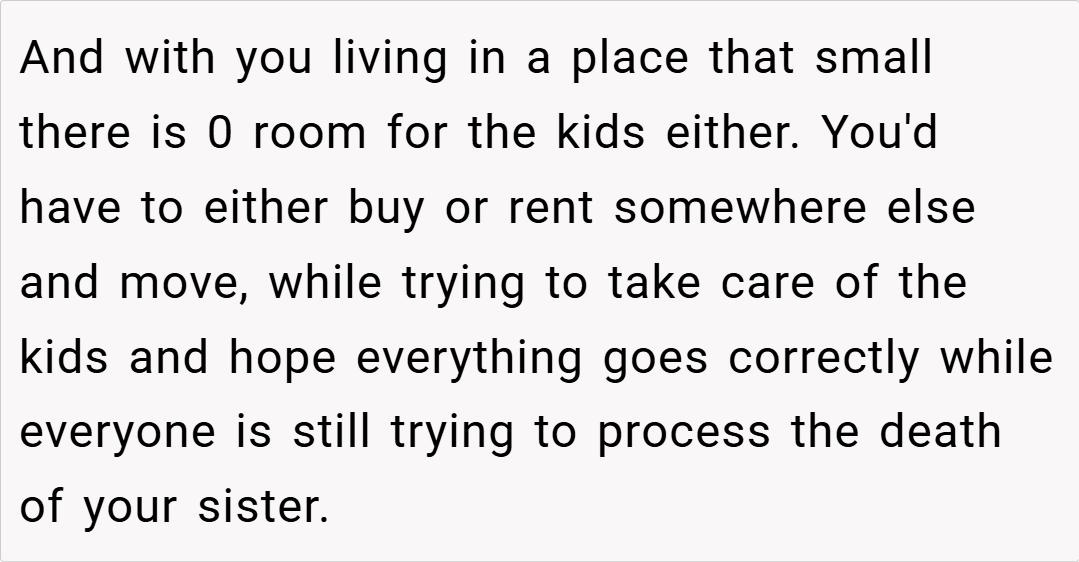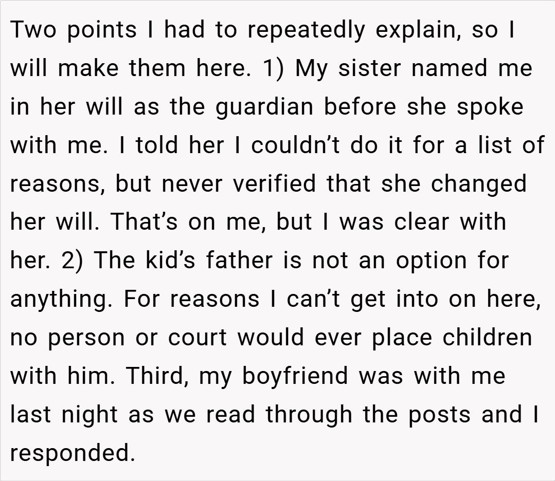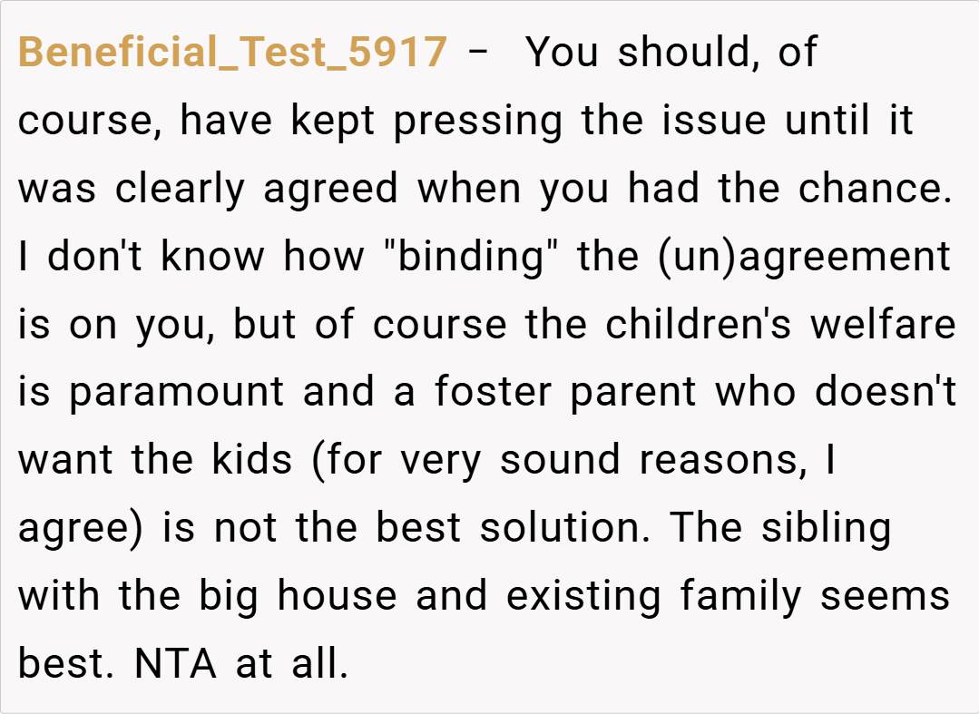 In the end, OP’s refusal to take on the role of guardian for her late sister’s children appears to be a well-considered decision based on her lifestyle, financial responsibilities, and emotional capacity. While her family sees it as a betrayal of her sister’s final wishes, it’s important to recognize that not every family member is equipped to handle such responsibilities. OP’s suggestion that someone else in the family might be better suited is a call for a more balanced approach.