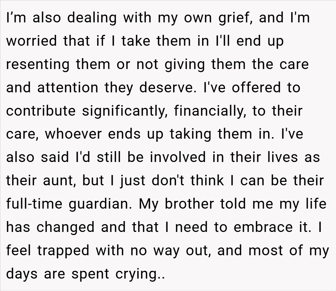 Now, when her family insists that she should take them in, OP is forced to choose between honoring her sister’s wishes and protecting her own future—and she wonders if she’s the asshole for not wanting to take on a role she never desired. Despite loving her nieces and nephew deeply, OP is candid about her limitations. She fears that assuming full-time guardianship would disrupt her life and potentially result in resentment,