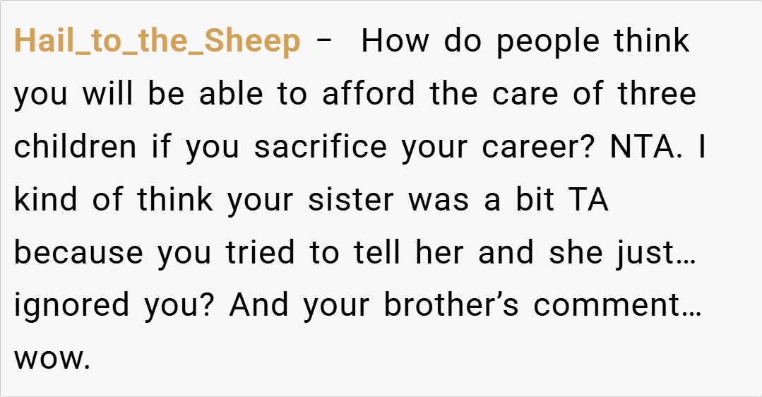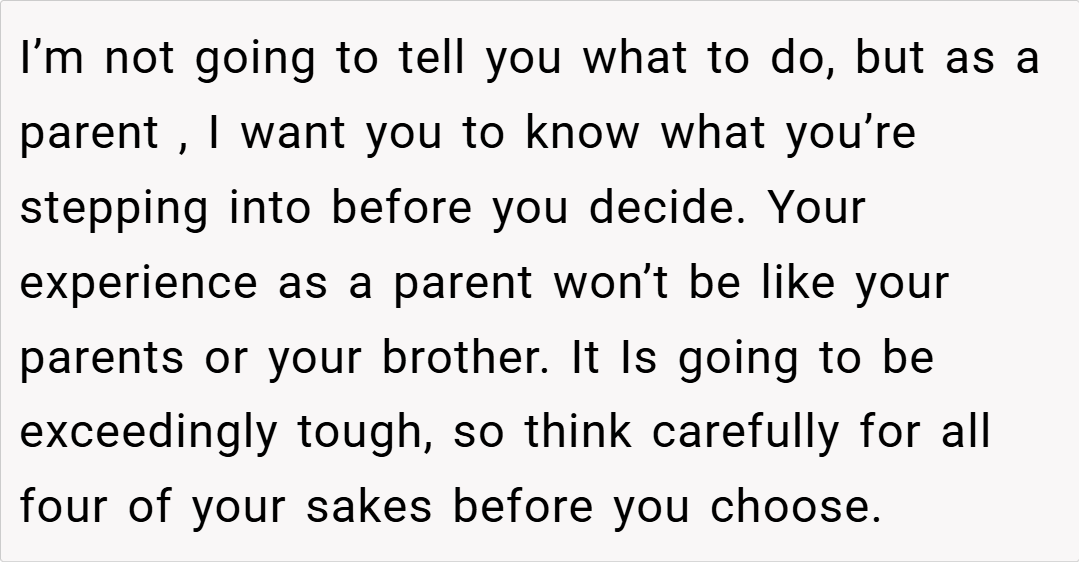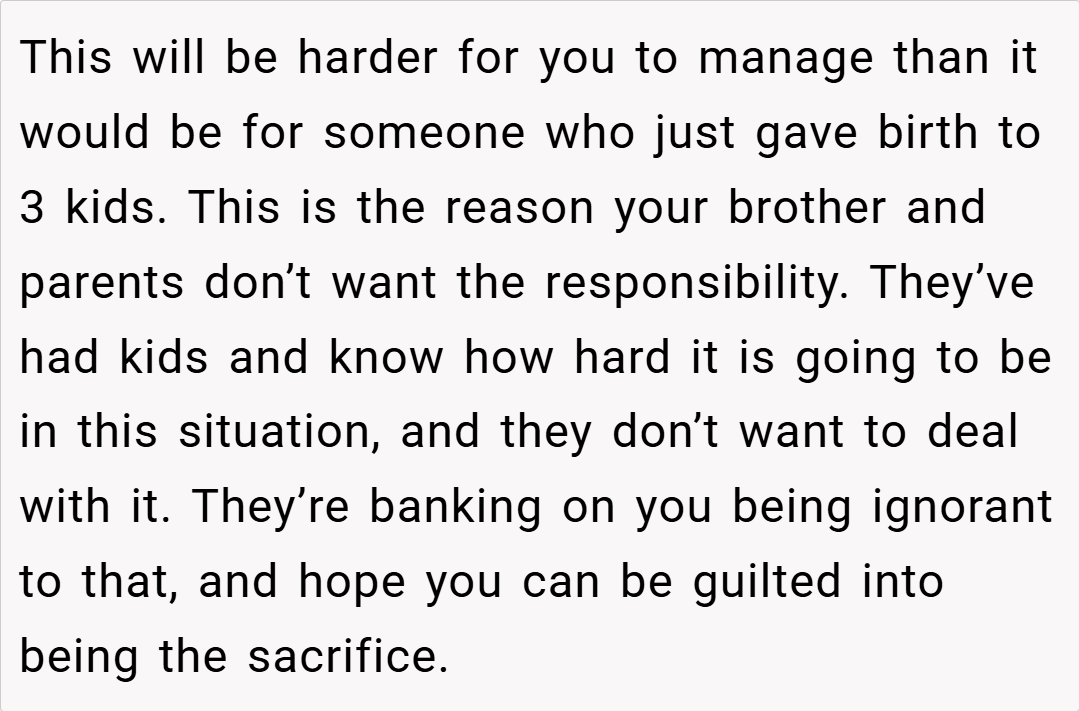Many redditors empathize with OP’s situation, noting that not everyone is cut out for full-time parenting—even when it comes to caring for family. “If you never planned to have kids and your life is already hectic, you shouldn’t be forced into a role you never wanted,” one commenter wrote.