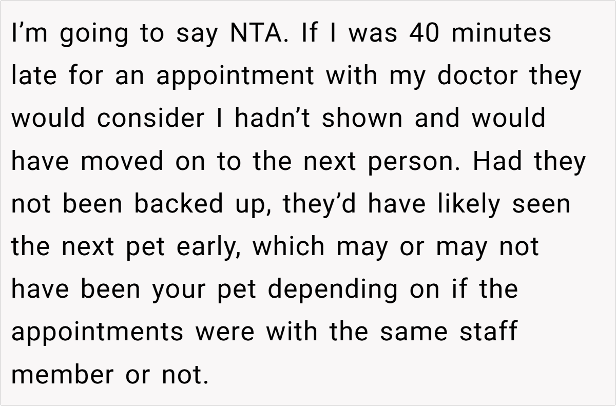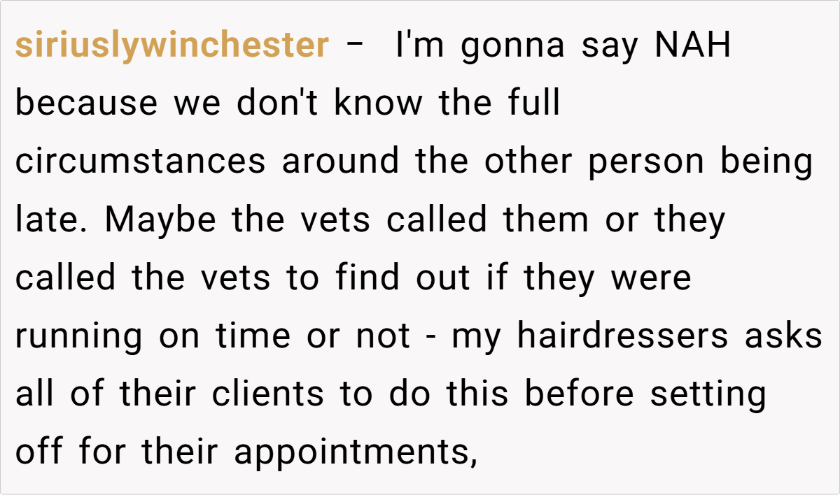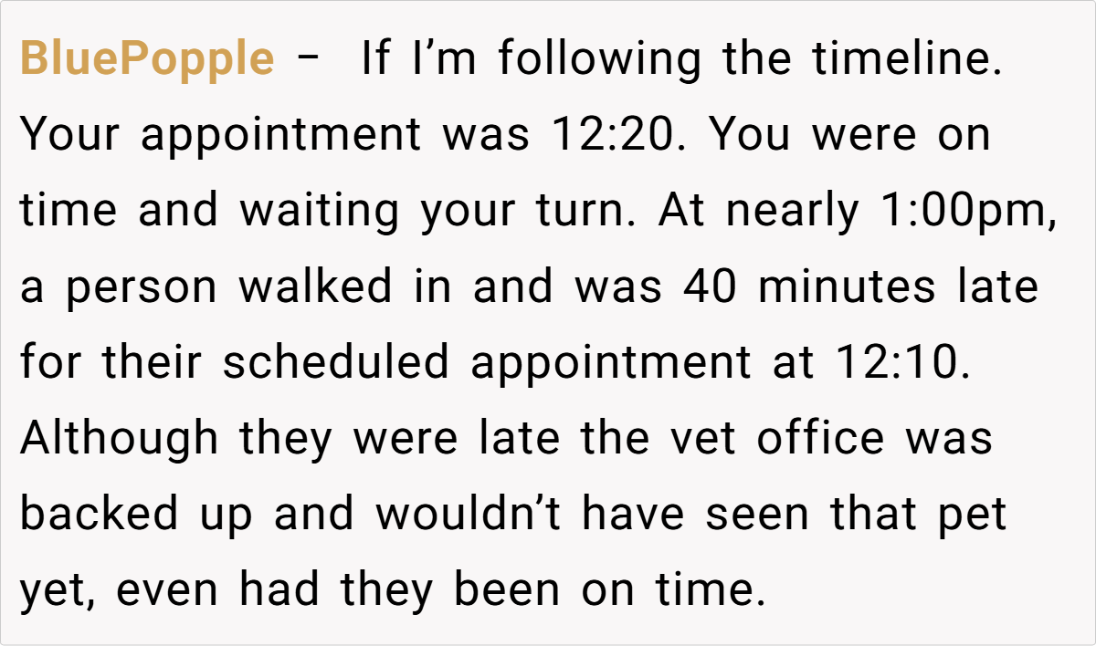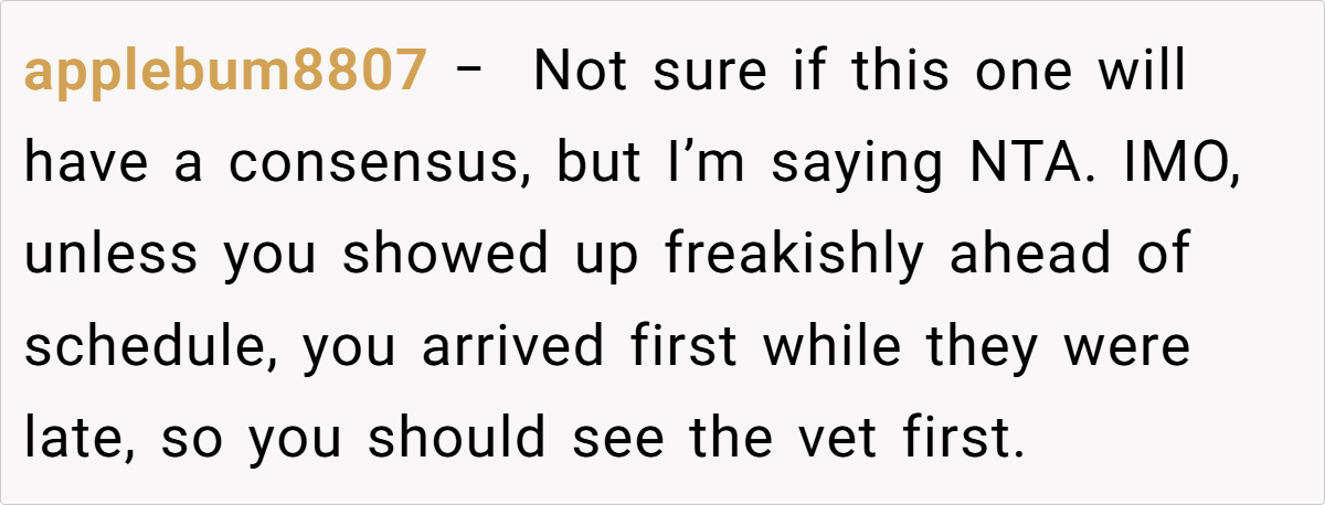 Others, however, suggested that there might have been extenuating circumstances—perhaps the latecomer had called ahead, although no one confirmed this. Some commenters mentioned that in a busy vet office, delays are sometimes inevitable and that a bit of patience could be warranted.