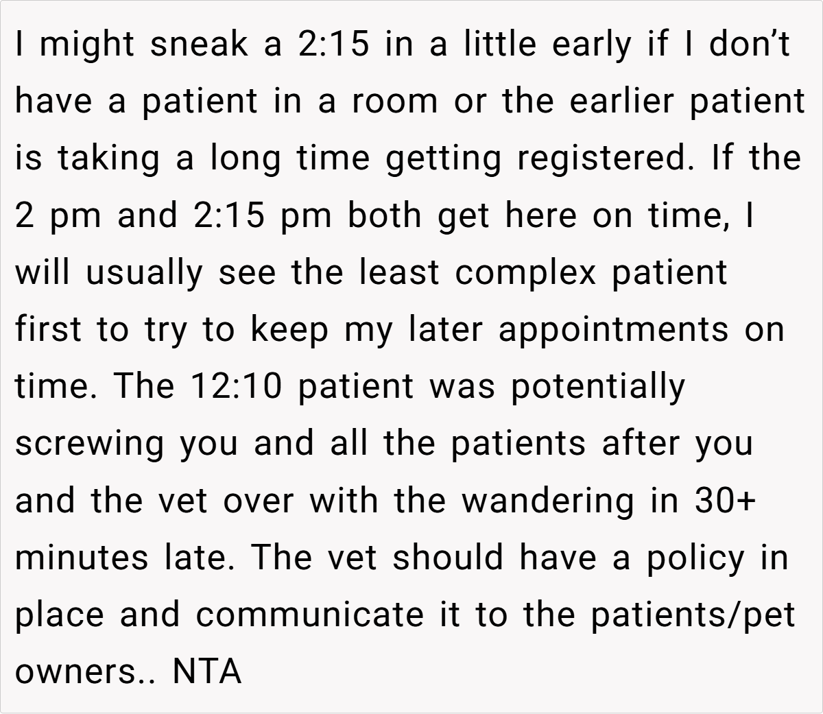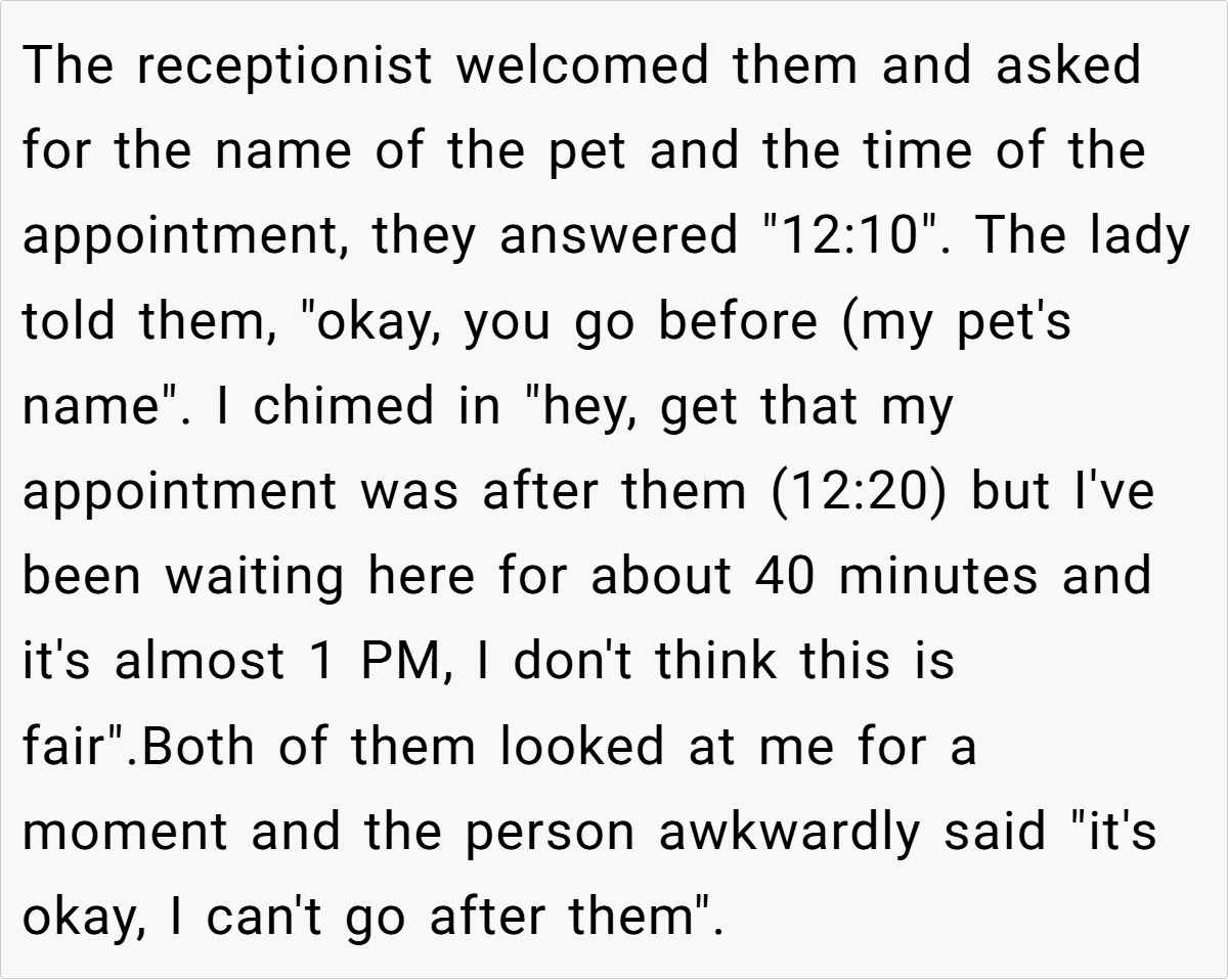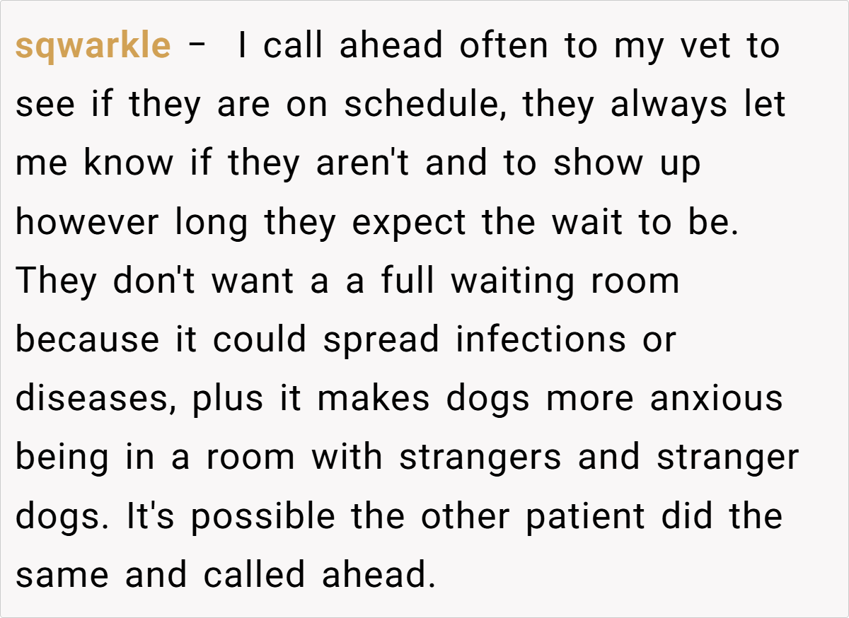 Others, however, suggested that there might have been extenuating circumstances—perhaps the latecomer had called ahead, although no one confirmed this. Some commenters mentioned that in a busy vet office, delays are sometimes inevitable and that a bit of patience could be warranted.