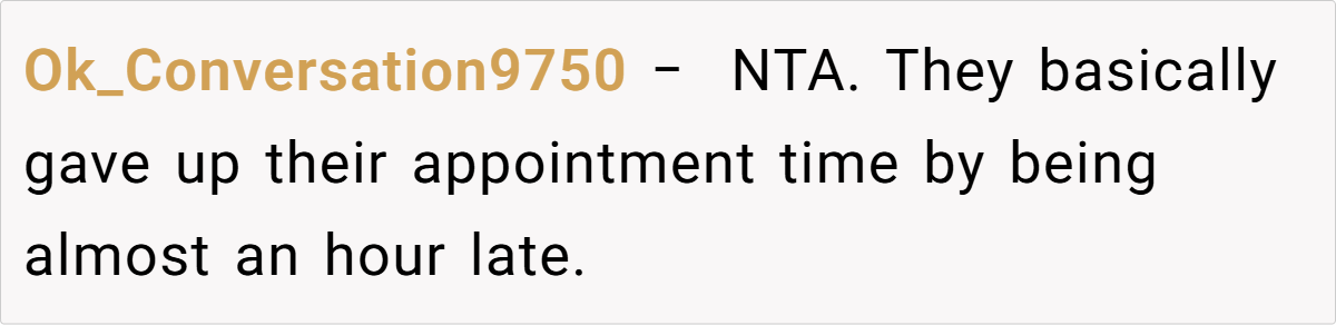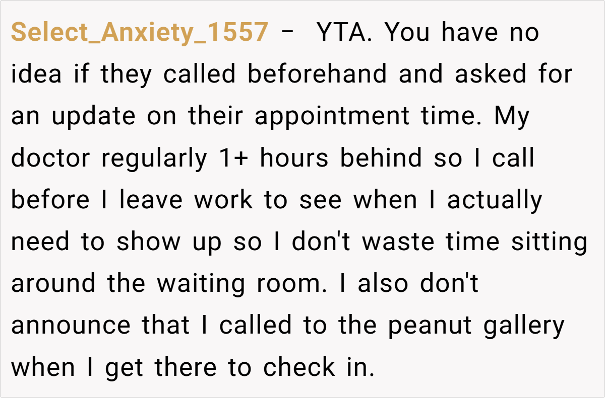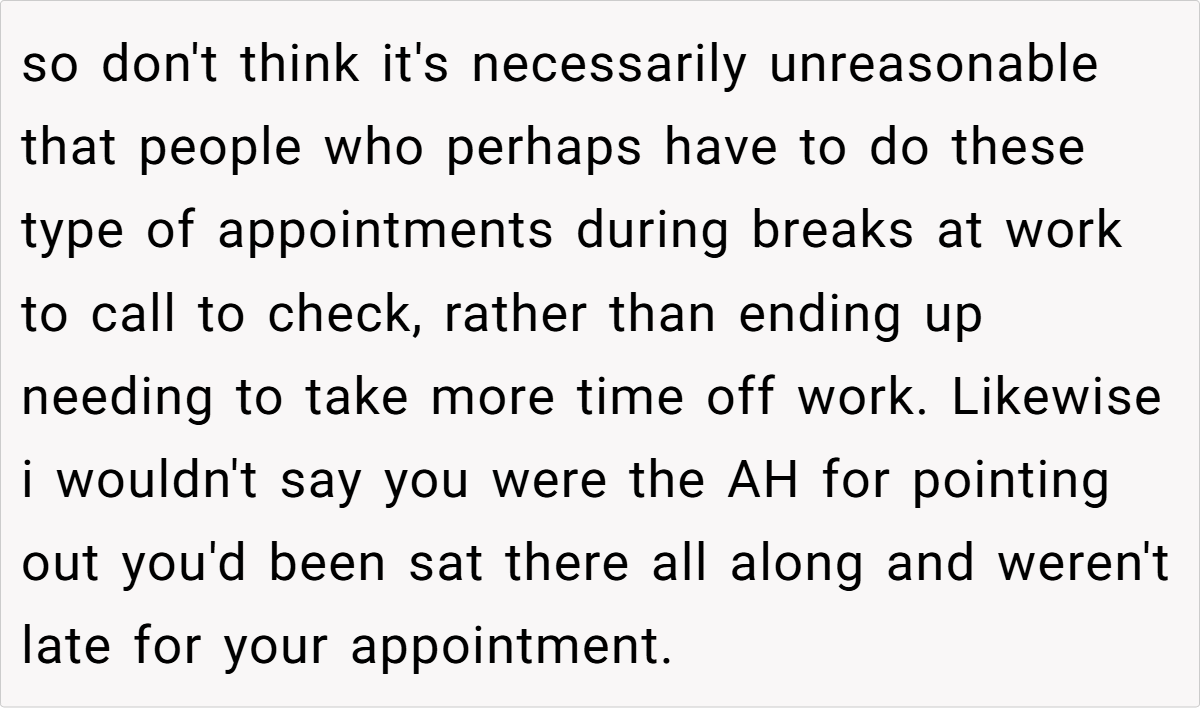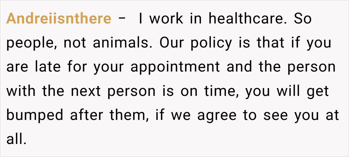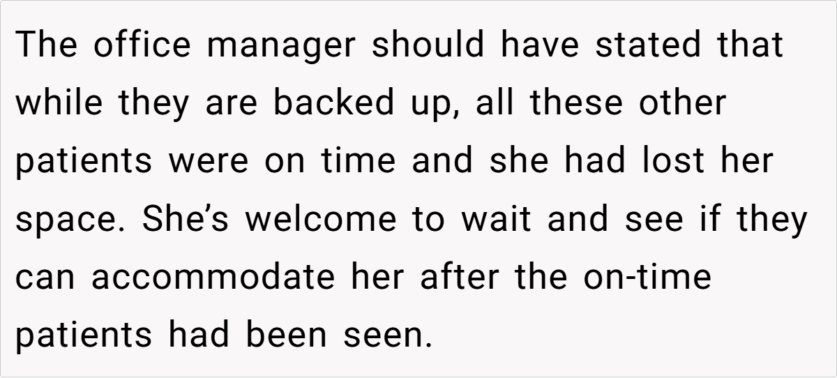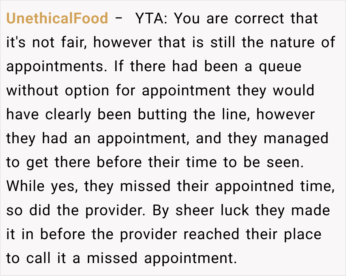 Still, the prevailing sentiment leaned toward “Not the Asshole.” Many agreed that when you’ve been waiting a long time while someone who arrived much later gets prioritized, it feels inherently unfair. One healthcare worker commented, “Our policy is that if you’re late, you lose your spot—even if the delay is due to external factors.