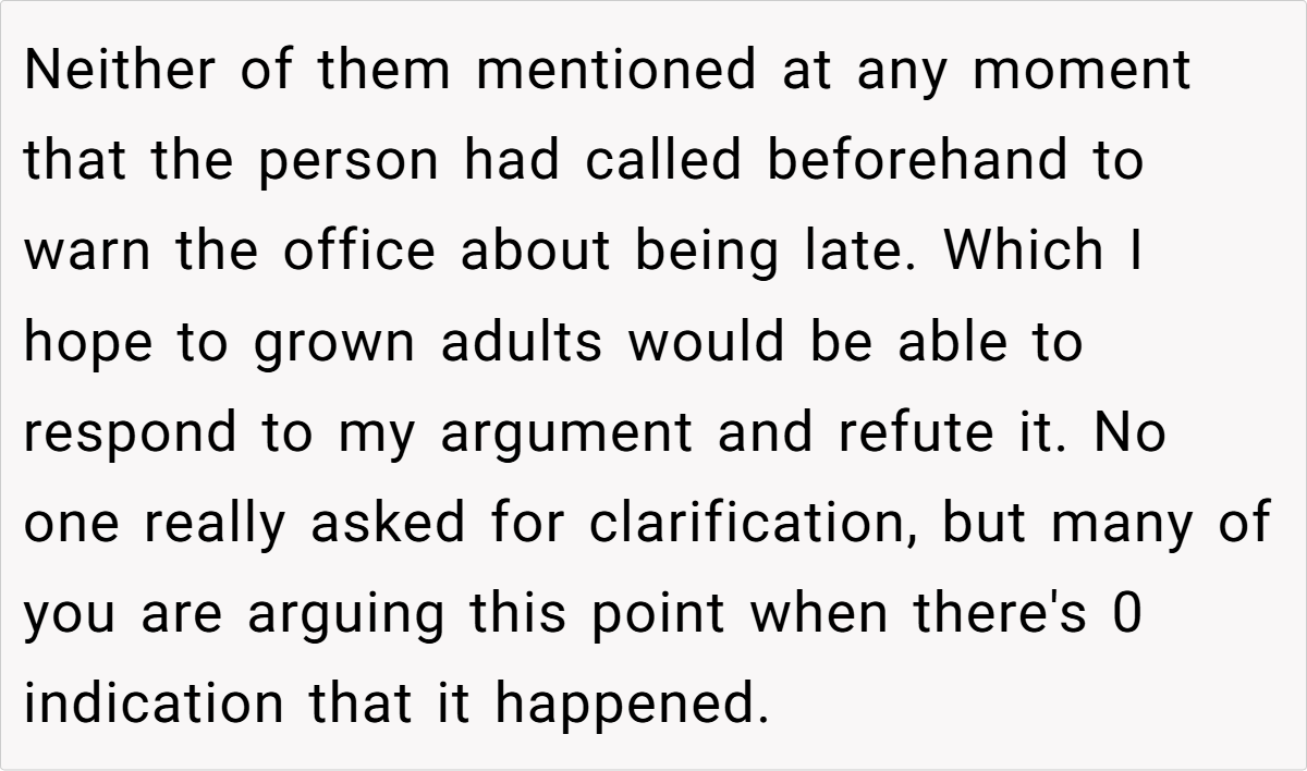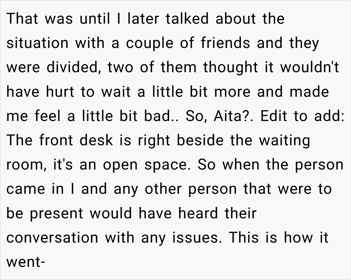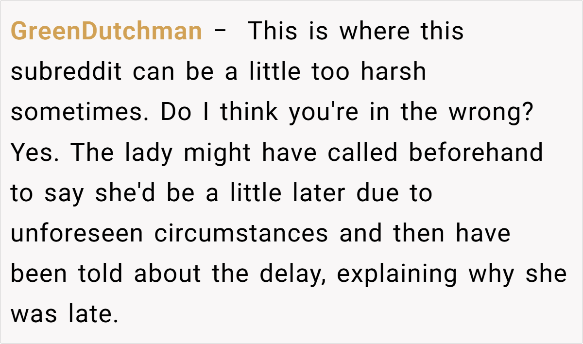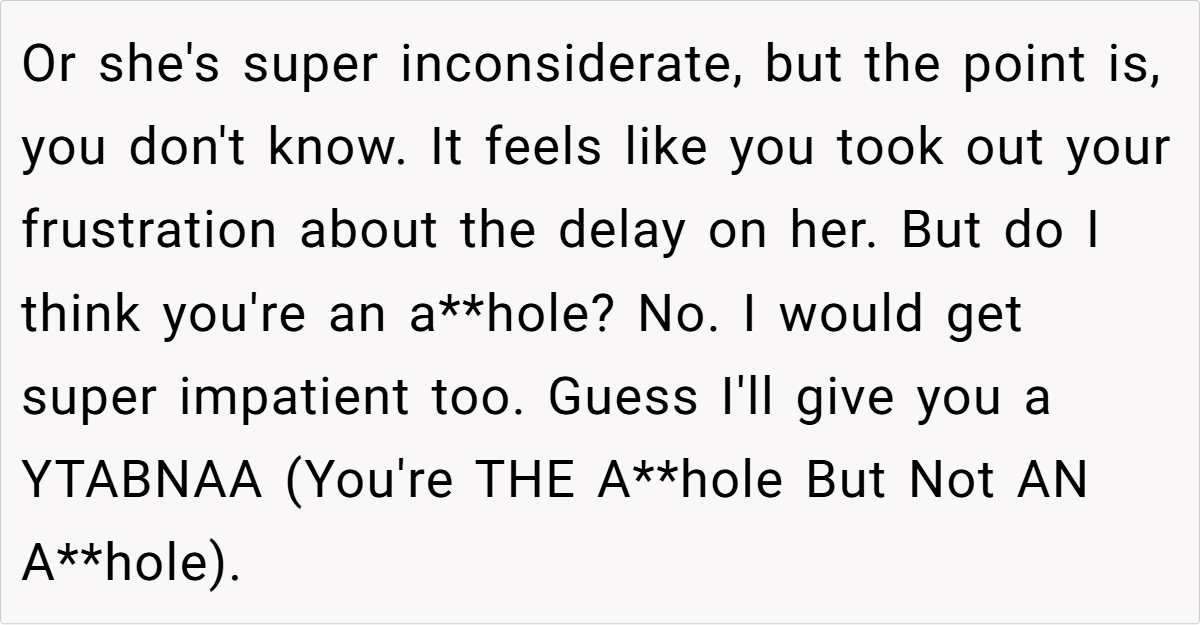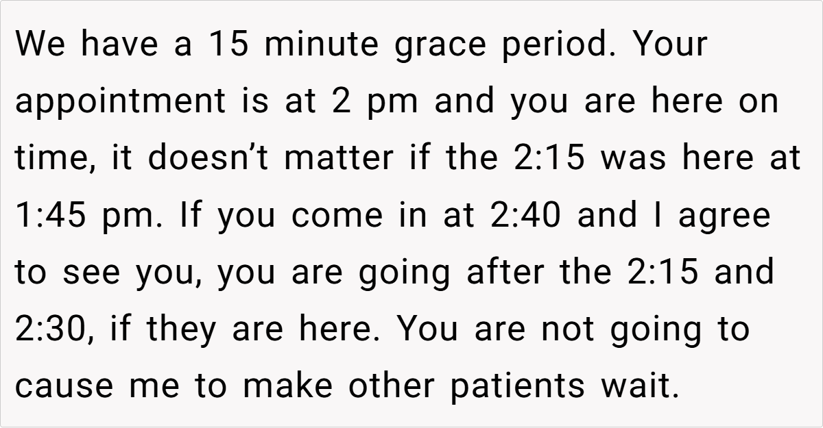 Still, the prevailing sentiment leaned toward “Not the Asshole.” Many agreed that when you’ve been waiting a long time while someone who arrived much later gets prioritized, it feels inherently unfair. One healthcare worker commented, “Our policy is that if you’re late, you lose your spot—even if the delay is due to external factors.