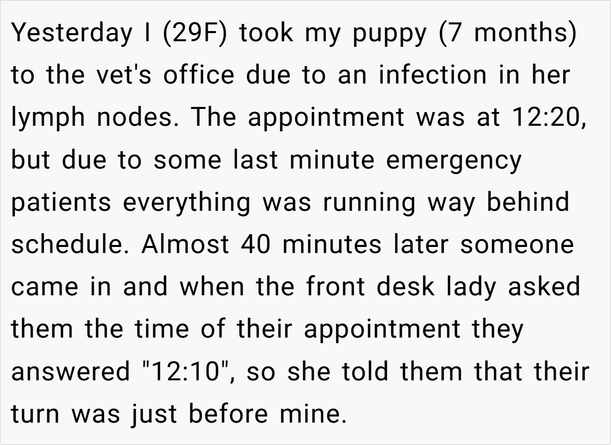There’s nothing quite as nerve-wracking as waiting for your pet’s appointment—especially when you’re already anxious about their health. Yesterday, I (29F) took my 7‐month-old puppy to the vet because of an infection in her lymph nodes. My appointment was scheduled for 12:20 PM, and I arrived right on time, settling in for what I hoped would be a smooth check-up.