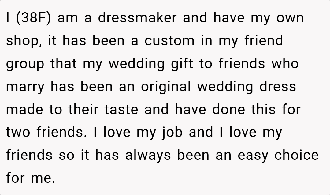 When creative passions and personal boundaries collide, even the most heartfelt traditions can lead to unexpected conflict. In this case, a 38-year-old dressmaker—known among her friends for crafting custom wedding dresses as a wedding gift—found herself in a tough spot when her friend announced her upcoming wedding.