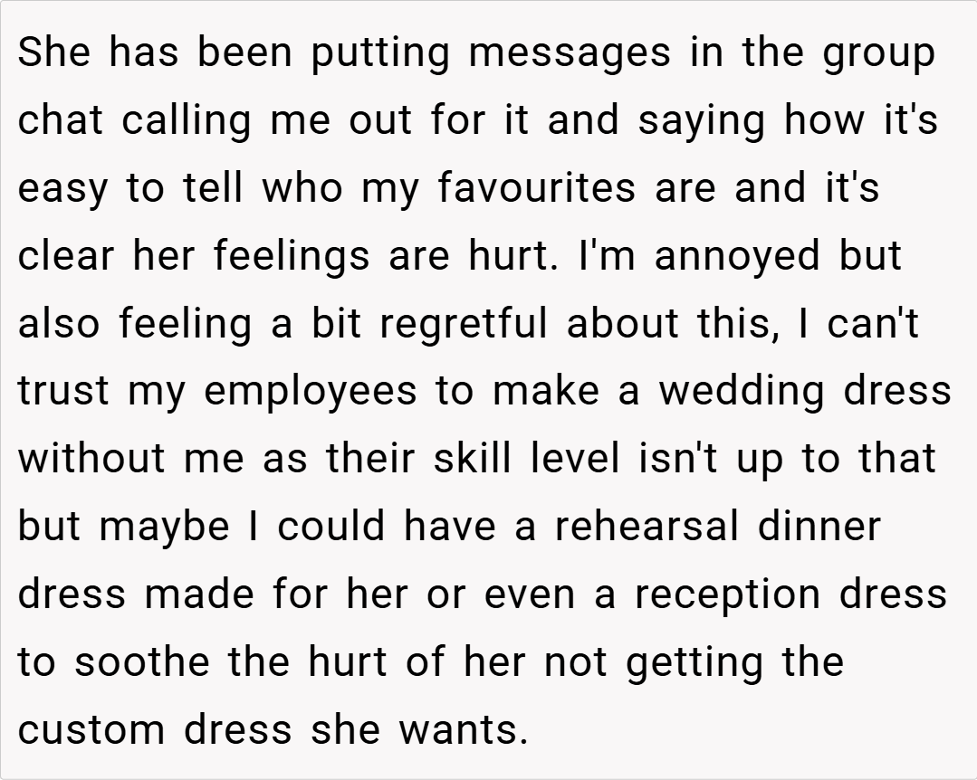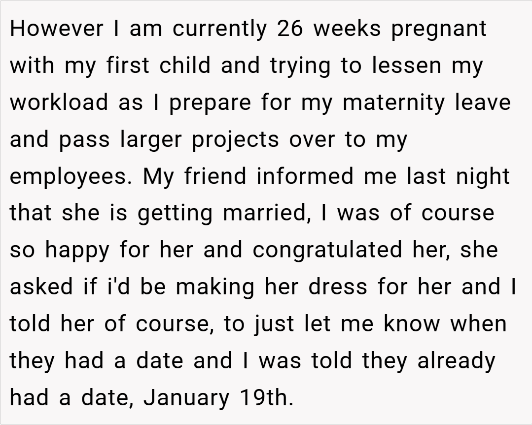 In this situation, the dressmaker’s longstanding tradition of making custom wedding dresses for friends was built on her full availability and creative energy. However, her current pregnancy and workload adjustments represent a significant shift in her life circumstances.