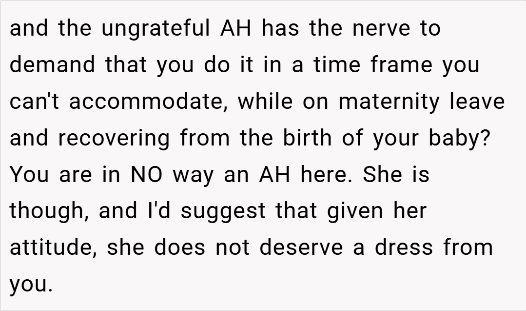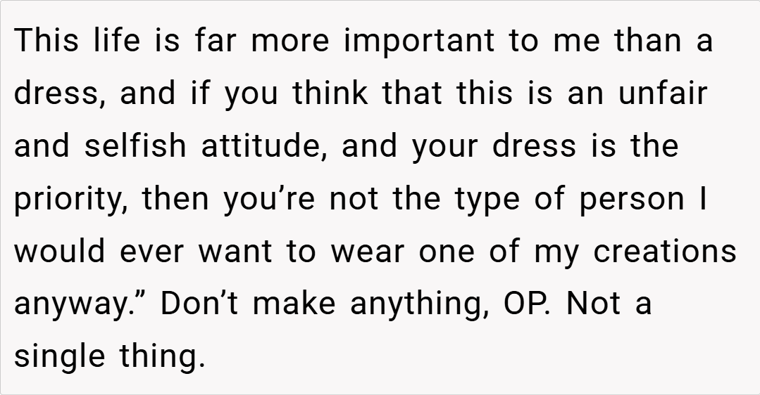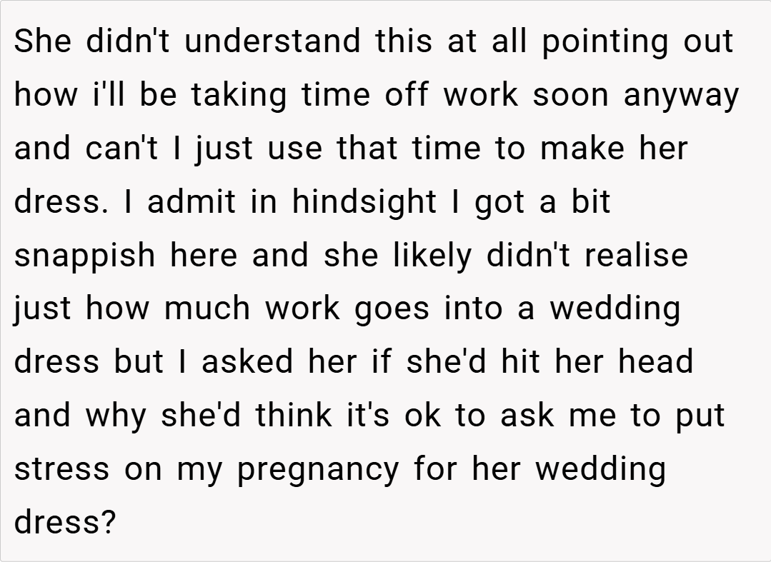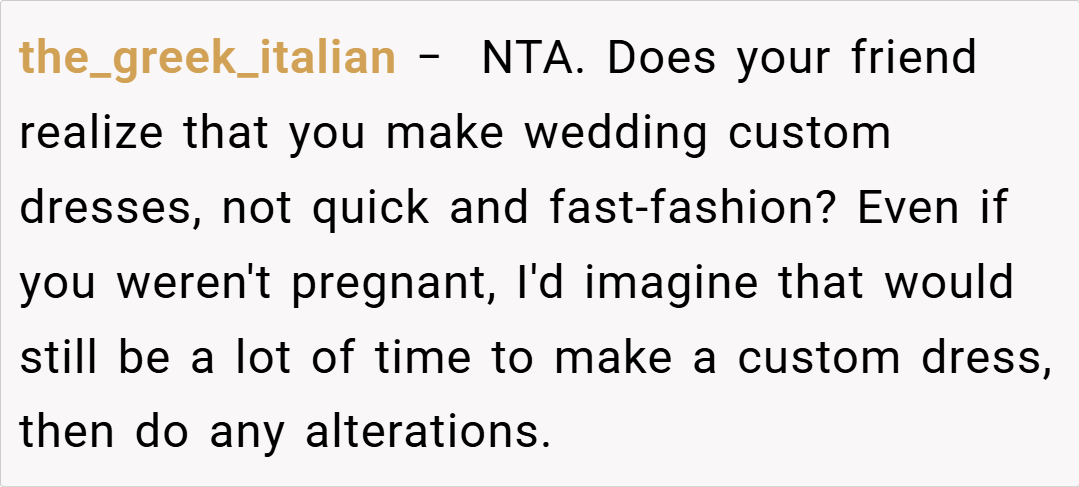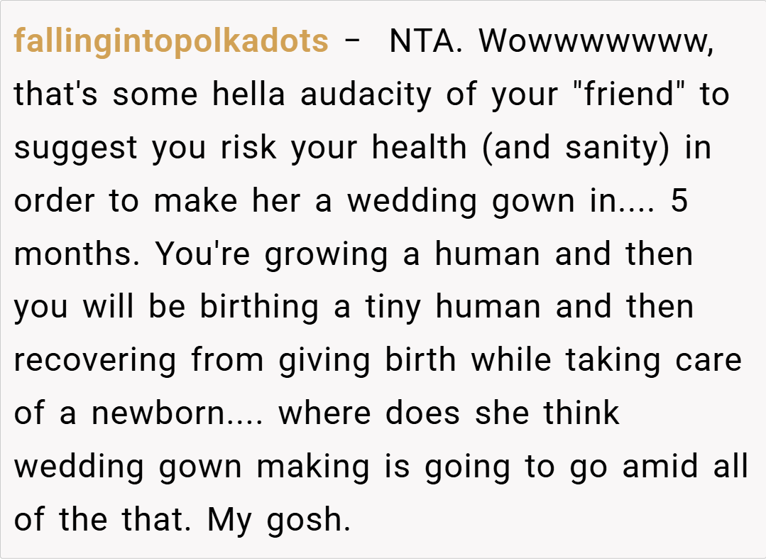 Many redditors sympathized with the dressmaker, noting that if she had clearly communicated her limitations from the start, her friend should have understood. Several users agreed that a project as significant as a custom wedding dress should not be taken lightly, especially when a major life event like pregnancy changes your capacity to work. Others joked that maybe her friend could settle for a “rehearsal dinner dress” instead, applauding the dressmaker for prioritizing her health and creative integrity.