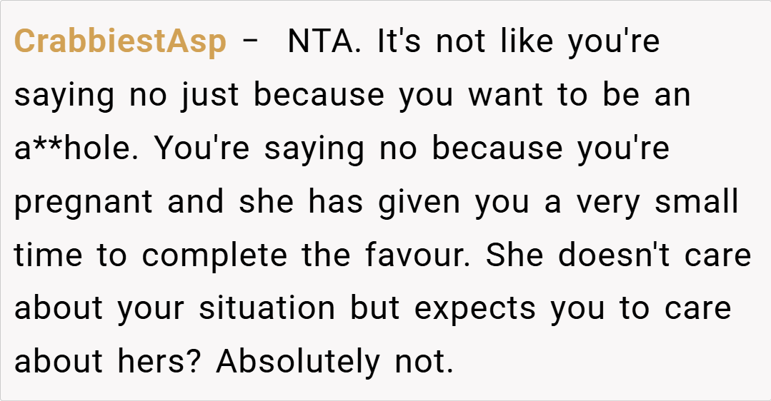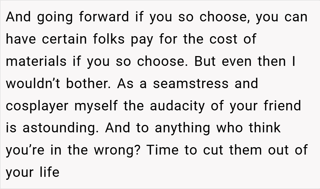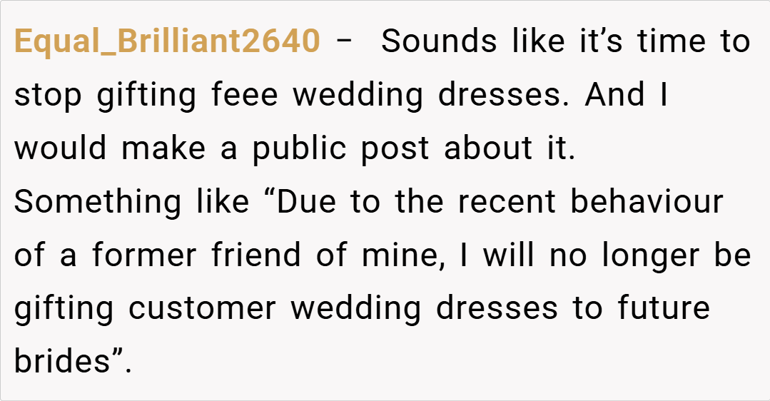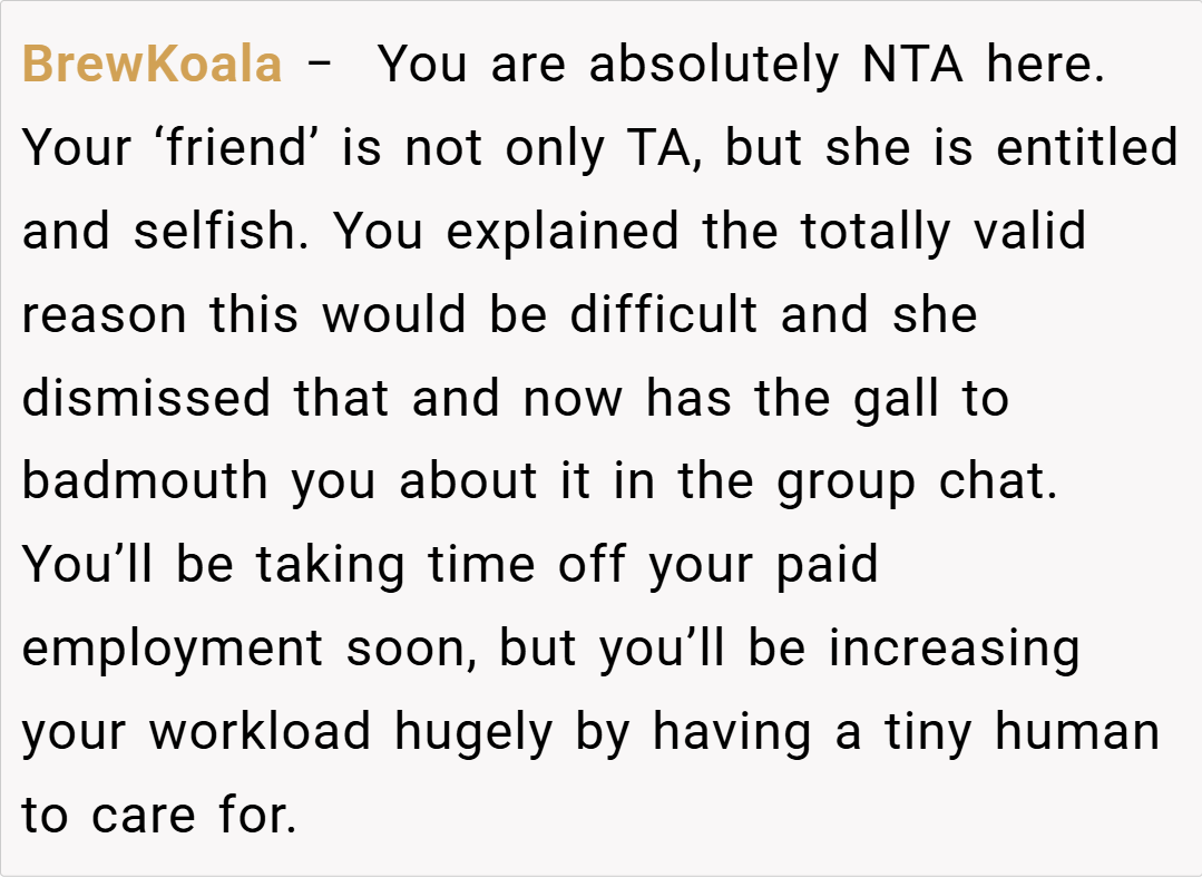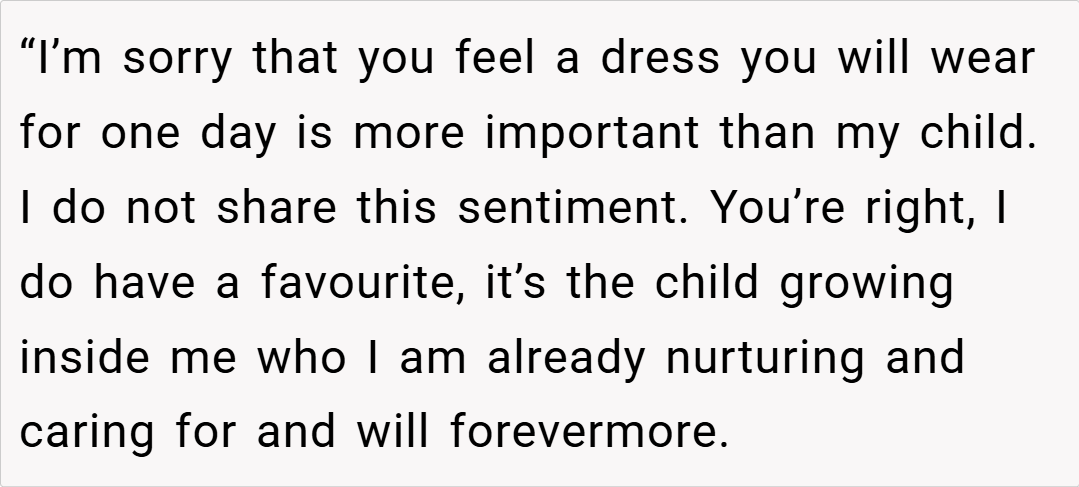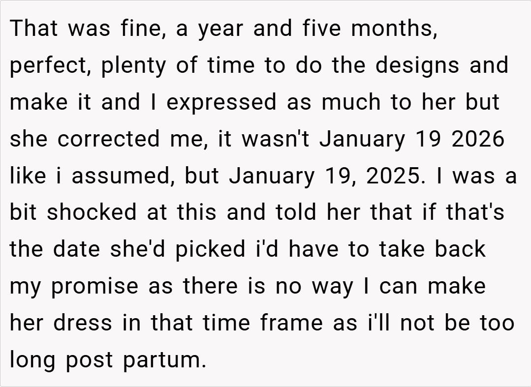 Many redditors sympathized with the dressmaker, noting that if she had clearly communicated her limitations from the start, her friend should have understood. Several users agreed that a project as significant as a custom wedding dress should not be taken lightly, especially when a major life event like pregnancy changes your capacity to work. Others joked that maybe her friend could settle for a “rehearsal dinner dress” instead, applauding the dressmaker for prioritizing her health and creative integrity.