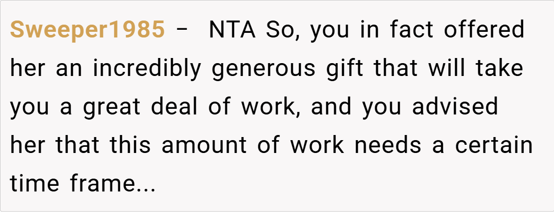 This sudden timeline meant she simply couldn’t commit to creating a custom dress in time, and her blunt refusal left her friend feeling hurt and accused her of playing favorites. Now, tensions are high as she stands by her decision, questioning whether she’s being unreasonable for prioritizing her health and professional responsibilities over a promise made under different circumstances.