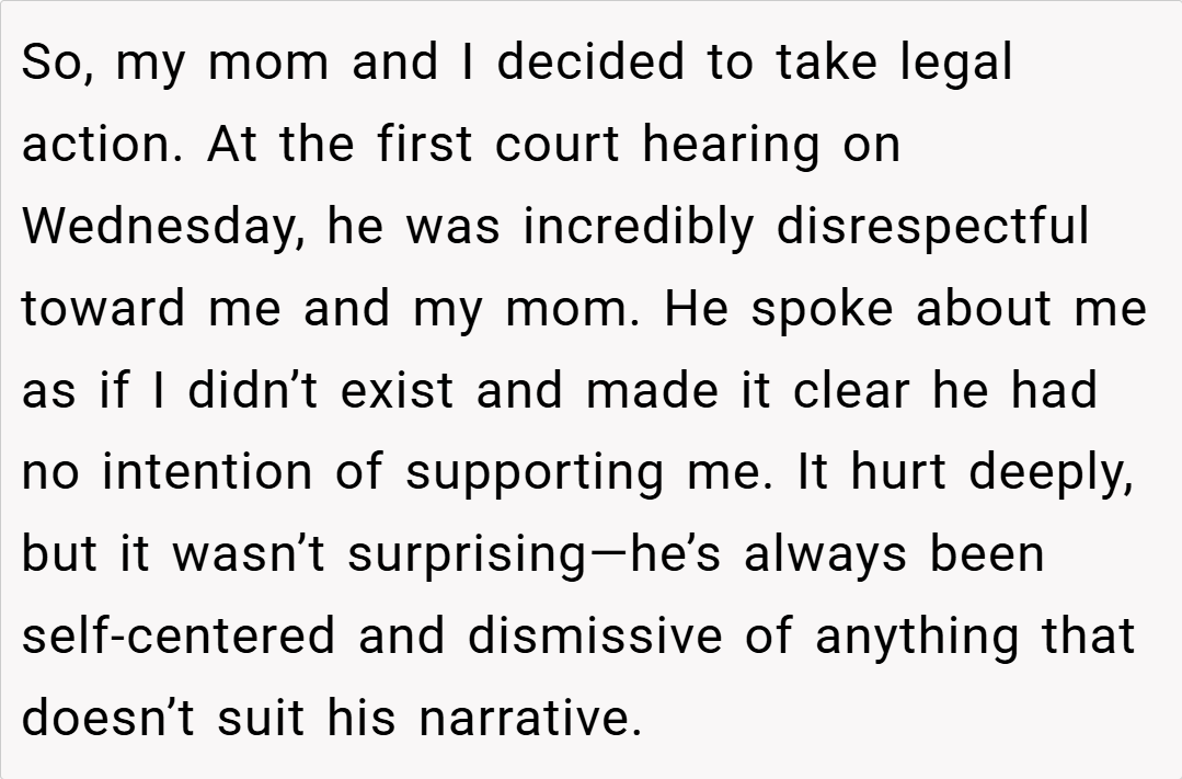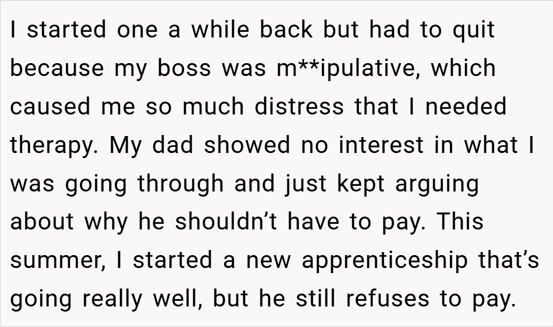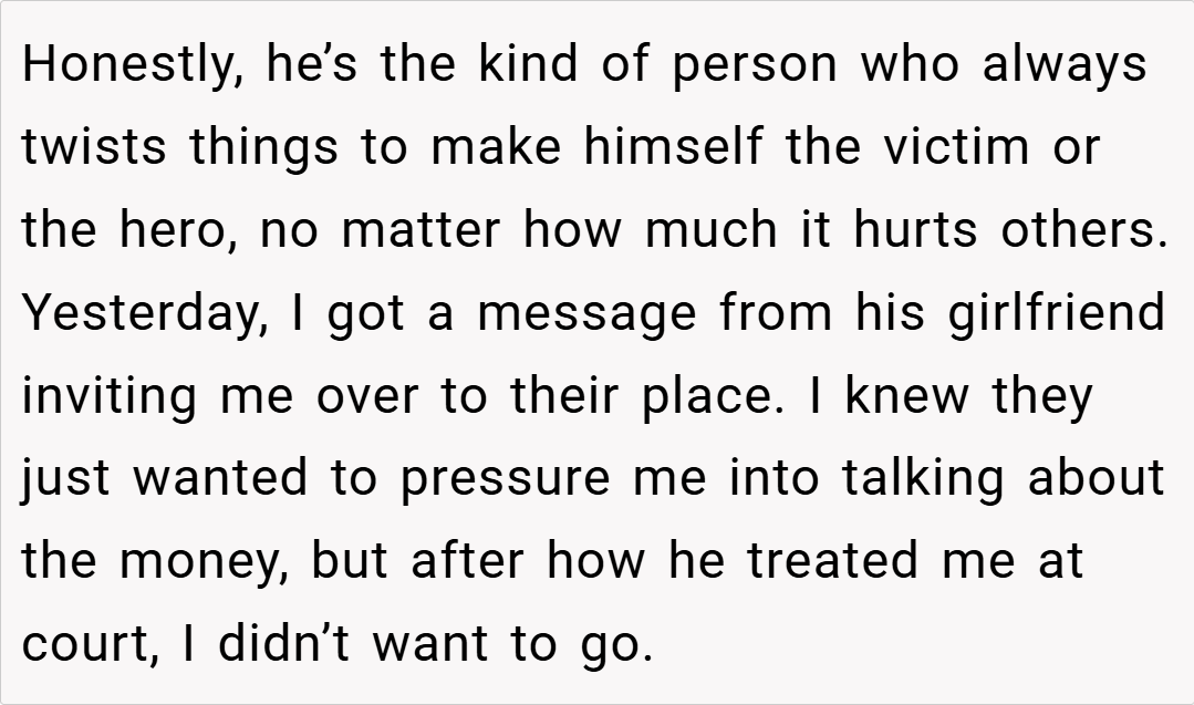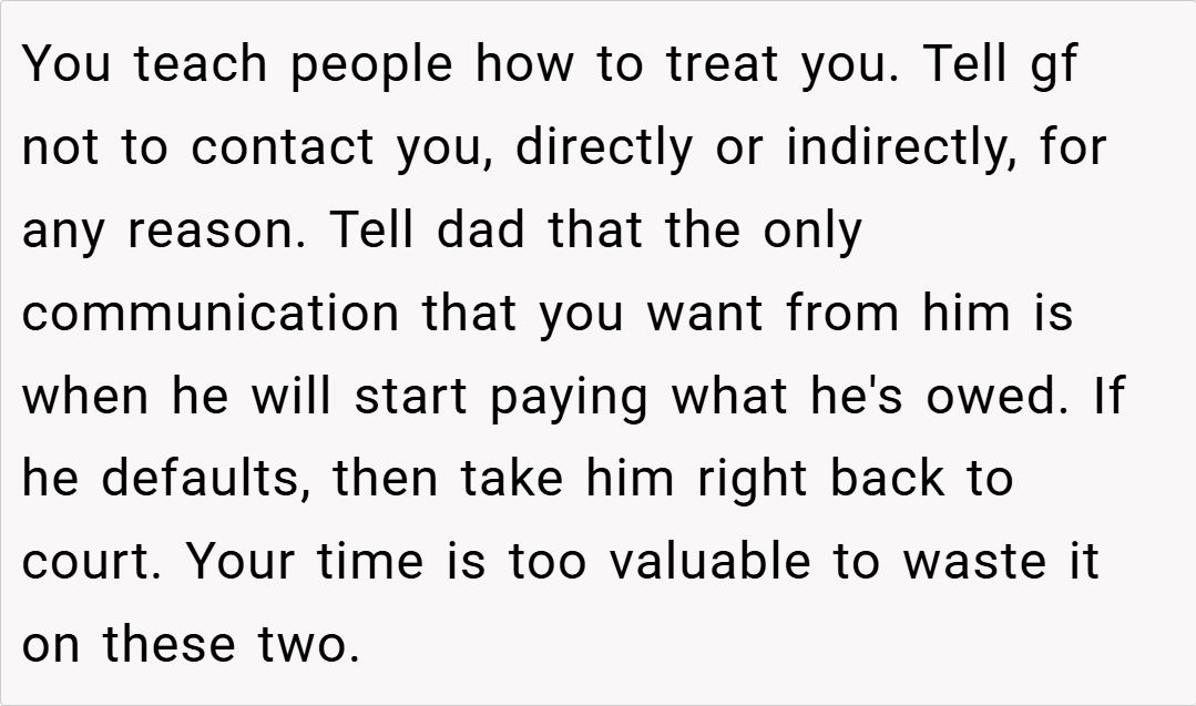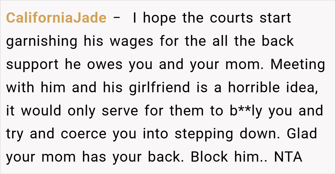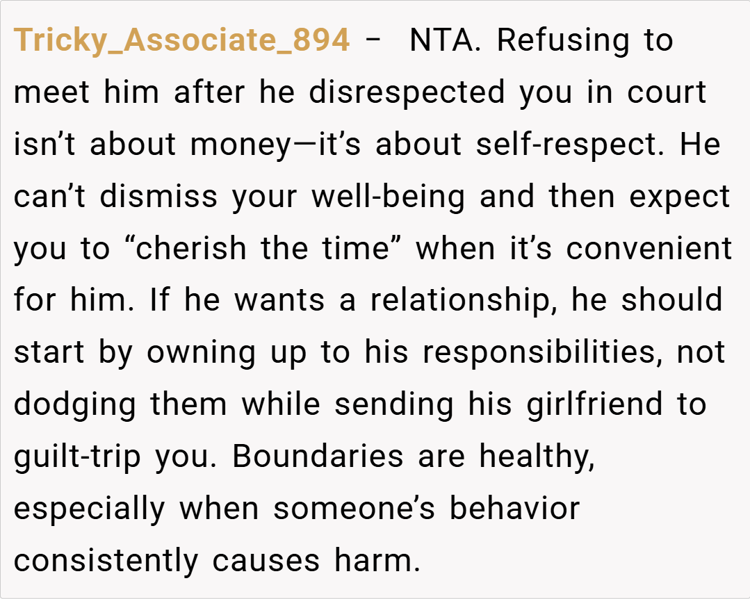 After years of his father’s consistent failure to pay adequate child support and a humiliating court appearance where his father dismissed his existence, our OP found the invitation from his father’s girlfriend to meet them utterly manipulative. Rather than reopening old wounds or being pressured into a conversation about money, he chose to stand his ground.