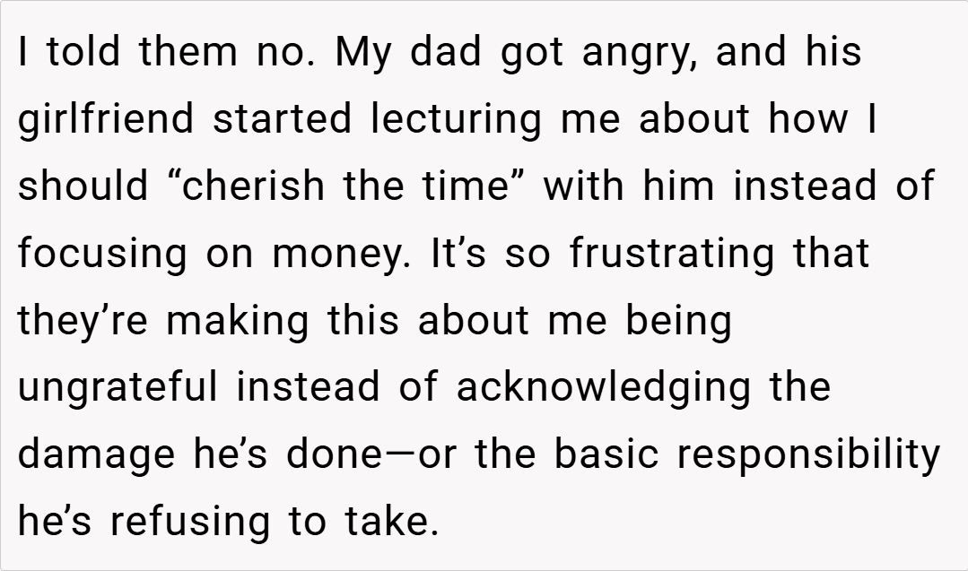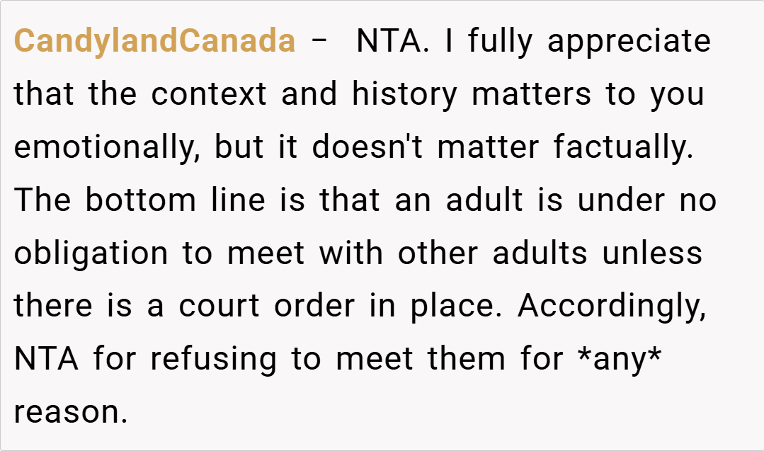 Overall, the Reddit community strongly supports our OP’s decision. Many commenters agree that refusing to meet his father and his girlfriend is a justified stand for self-respect, especially after years of neglect and humiliation. They stress that the invitation was merely a tactic to pressure him into discussing long-standing financial issues rather than genuine efforts to rebuild a relationship.