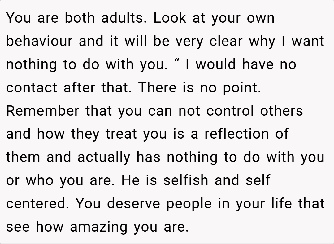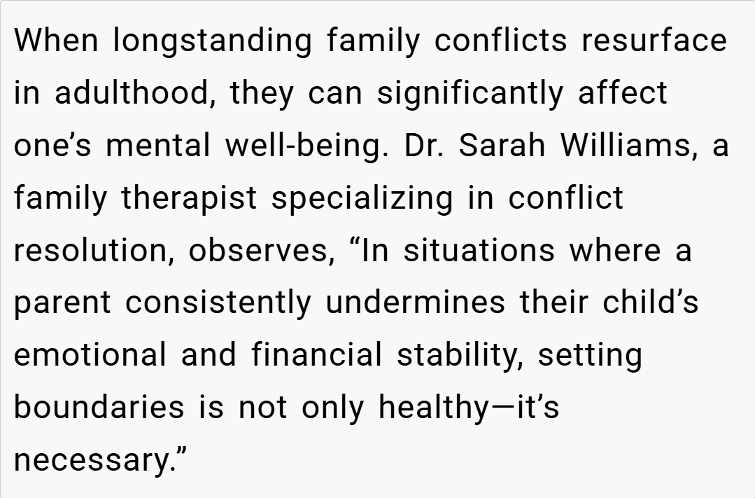 The goal isn’t to punish but to protect one’s own stability.” The message here is clear: while family connections are important, they should not come at the expense of one’s mental health. By standing firm, our OP asserts that respect must be mutual, and toxic patterns must be disrupted.