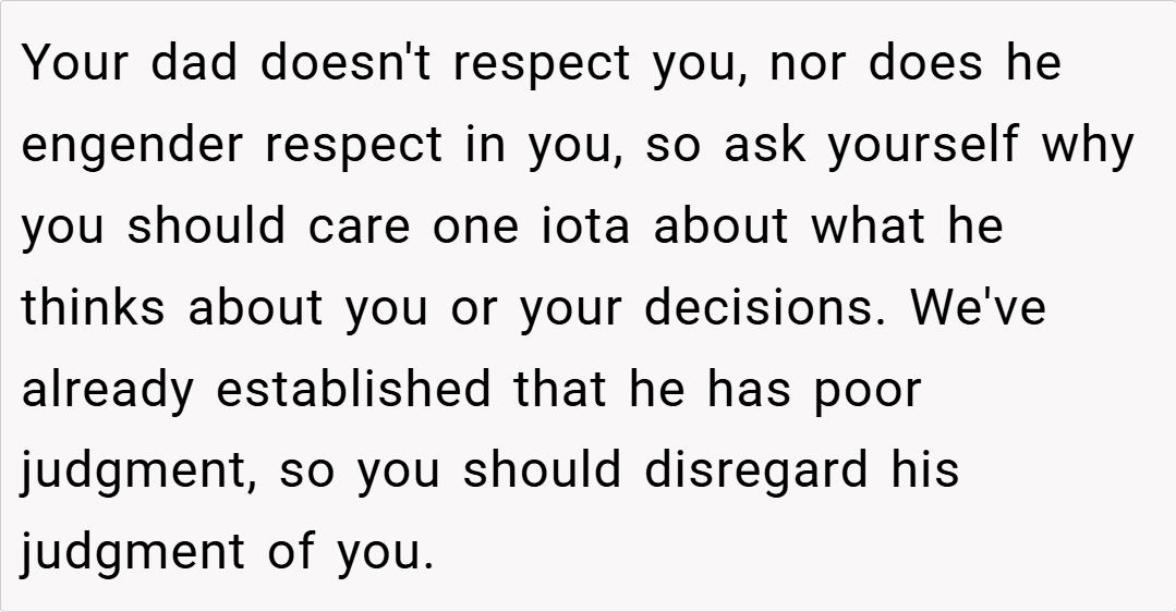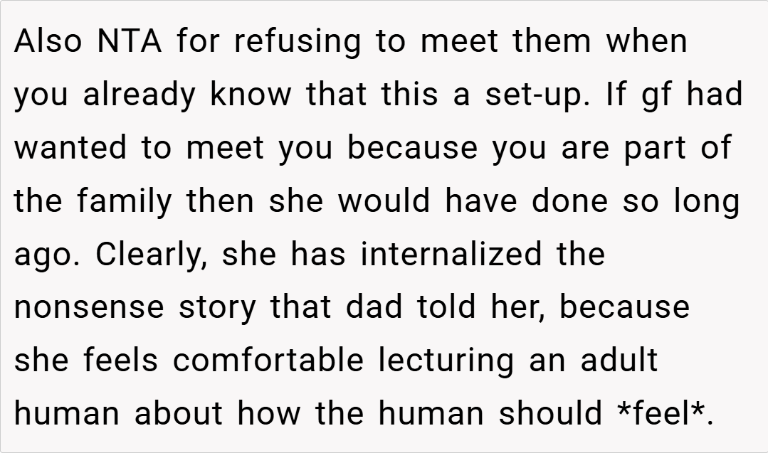 At the heart of this issue lies the importance of establishing boundaries when past wounds continue to inflict pain. Our OP’s choice to refuse a meeting with his father and his girlfriend isn’t about being ungrateful—it’s about reclaiming his self-worth and protecting his emotional health.