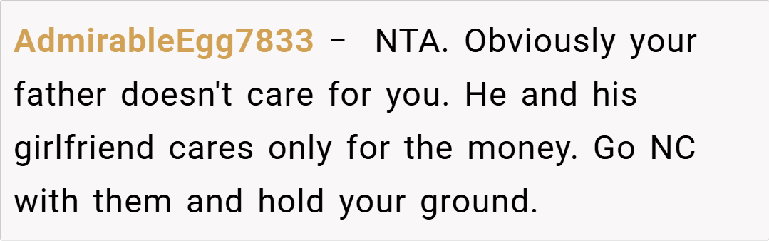 Some suggest that his father’s and girlfriend’s behavior is toxic and manipulative, and that he deserves to protect his mental well-being. In essence, the consensus is that his decision to set firm boundaries is both understandable and necessary.