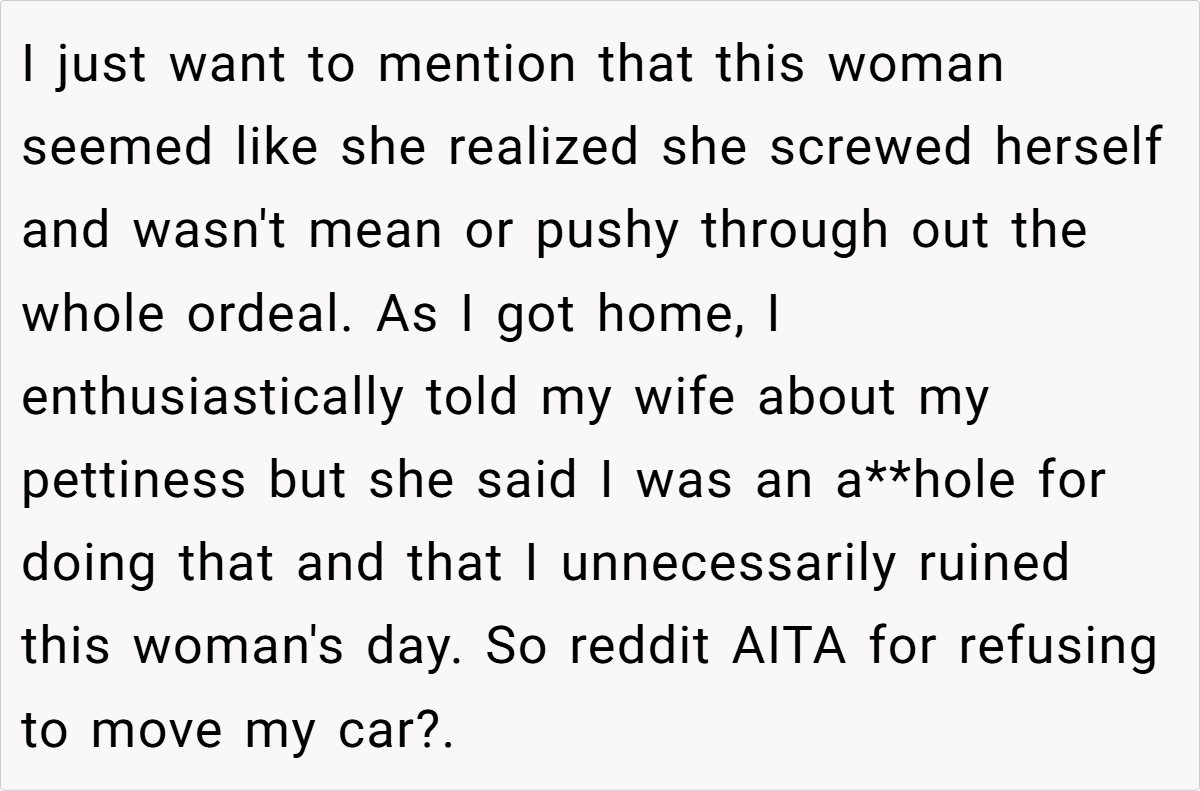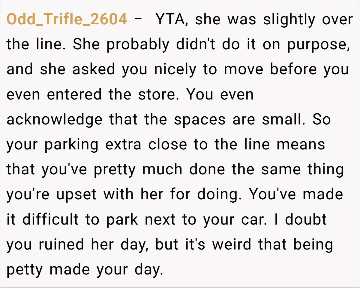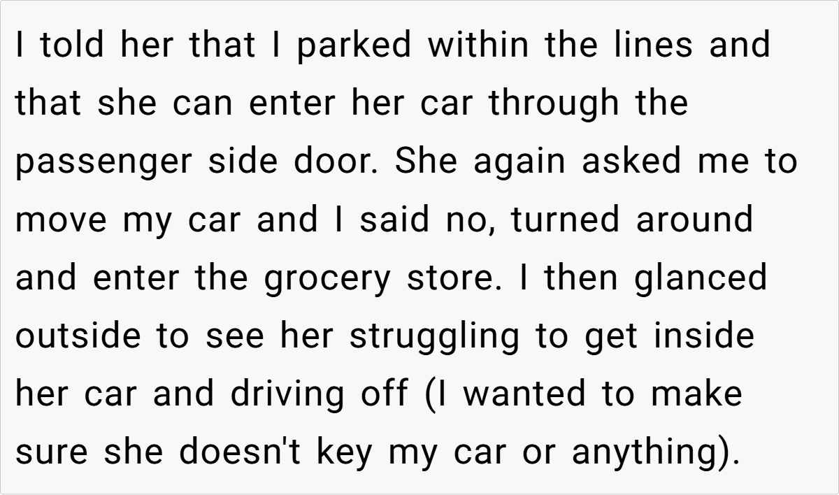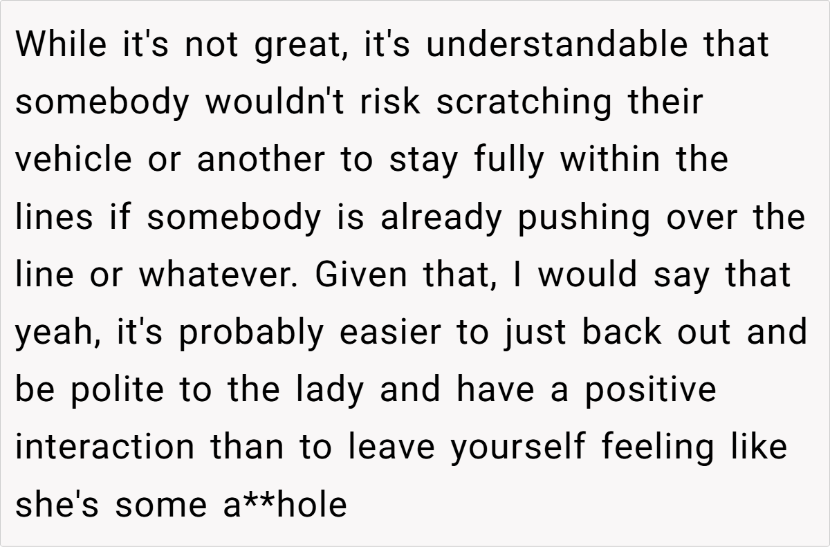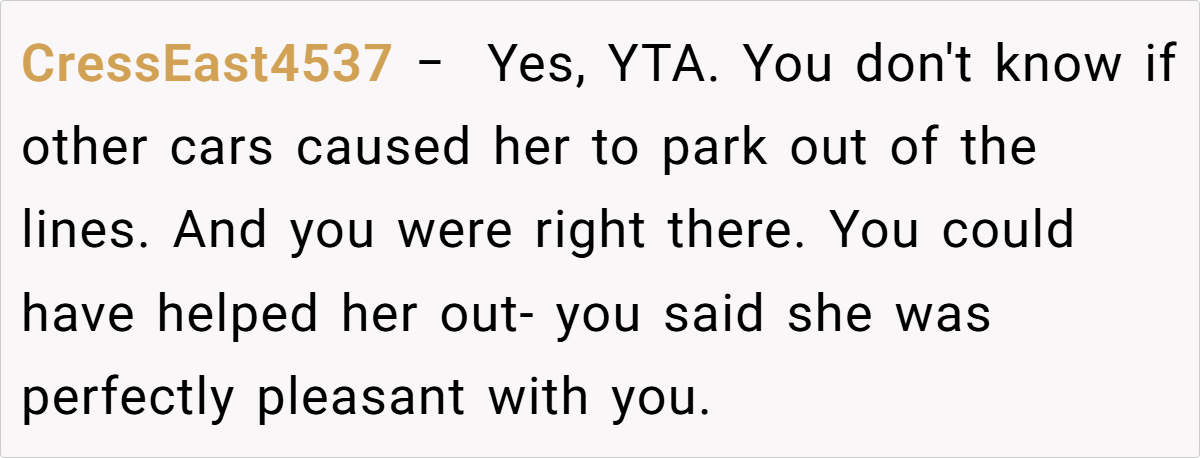 A Reddit user recounts a parking lot incident where he refused to move his car to help a woman enter her vehicle after she parked outside the lines. Despite parking within the lines himself, his wife later called him out for being unnecessarily petty. Read the original story below to see if his actions were justified or if he went too far.