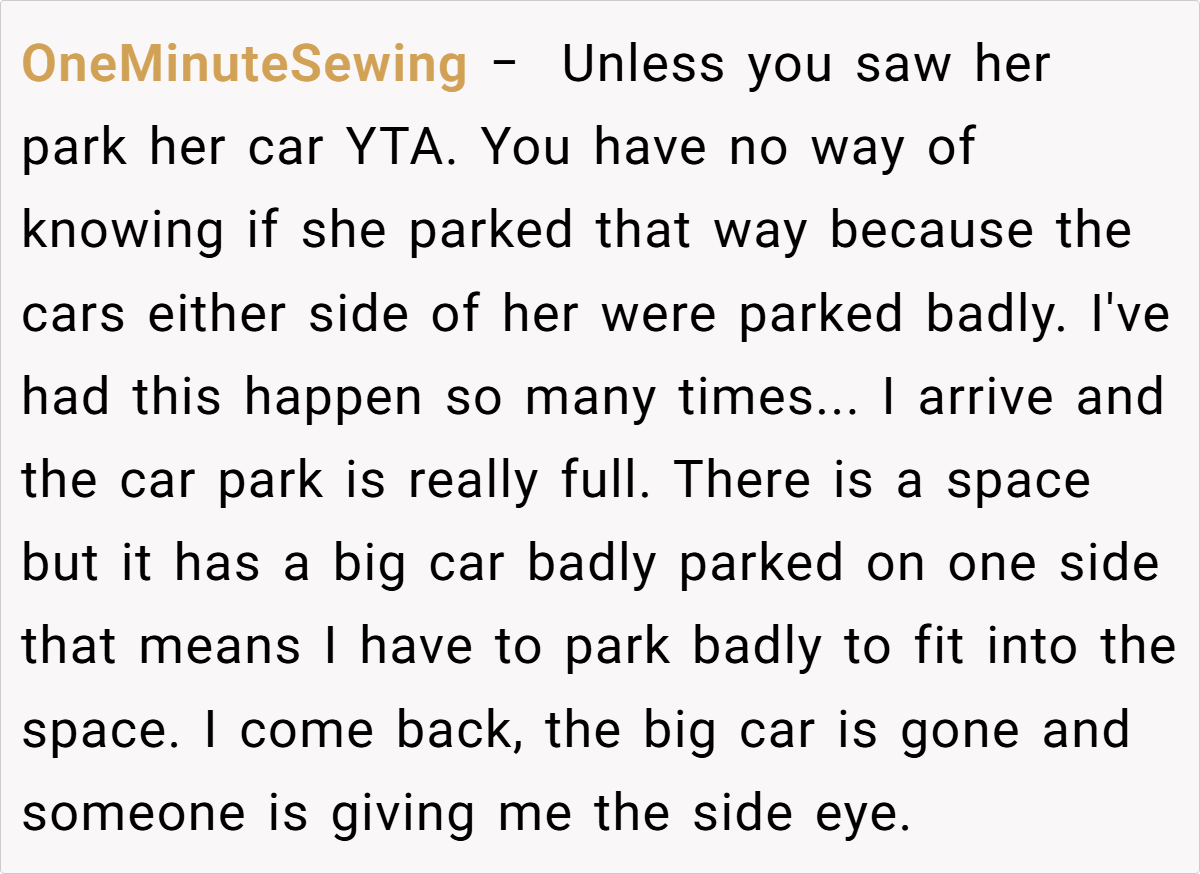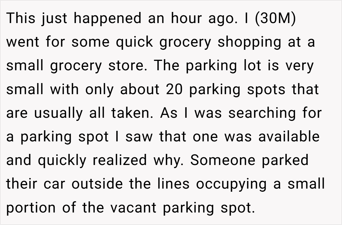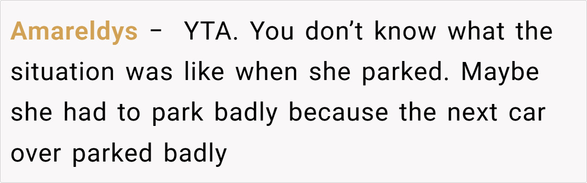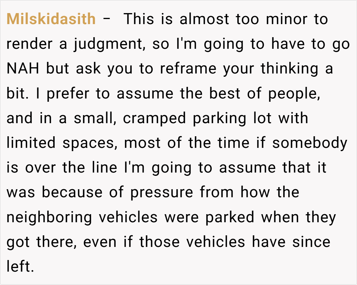 A Reddit user recounts a parking lot incident where he refused to move his car to help a woman enter her vehicle after she parked outside the lines. Despite parking within the lines himself, his wife later called him out for being unnecessarily petty. Read the original story below to see if his actions were justified or if he went too far.