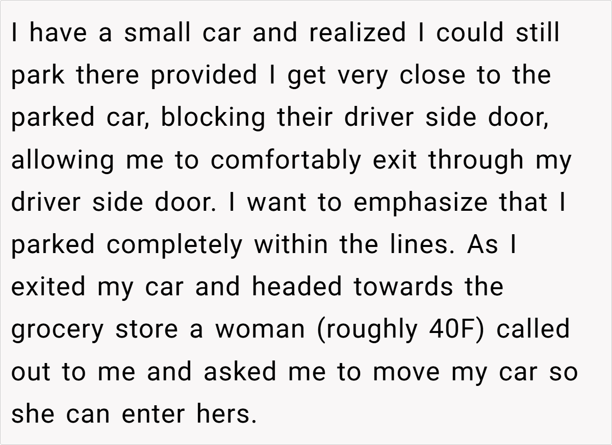 ‘ AITA for refusing to move my car to help a woman enter her car when she parked outside the lines?’
