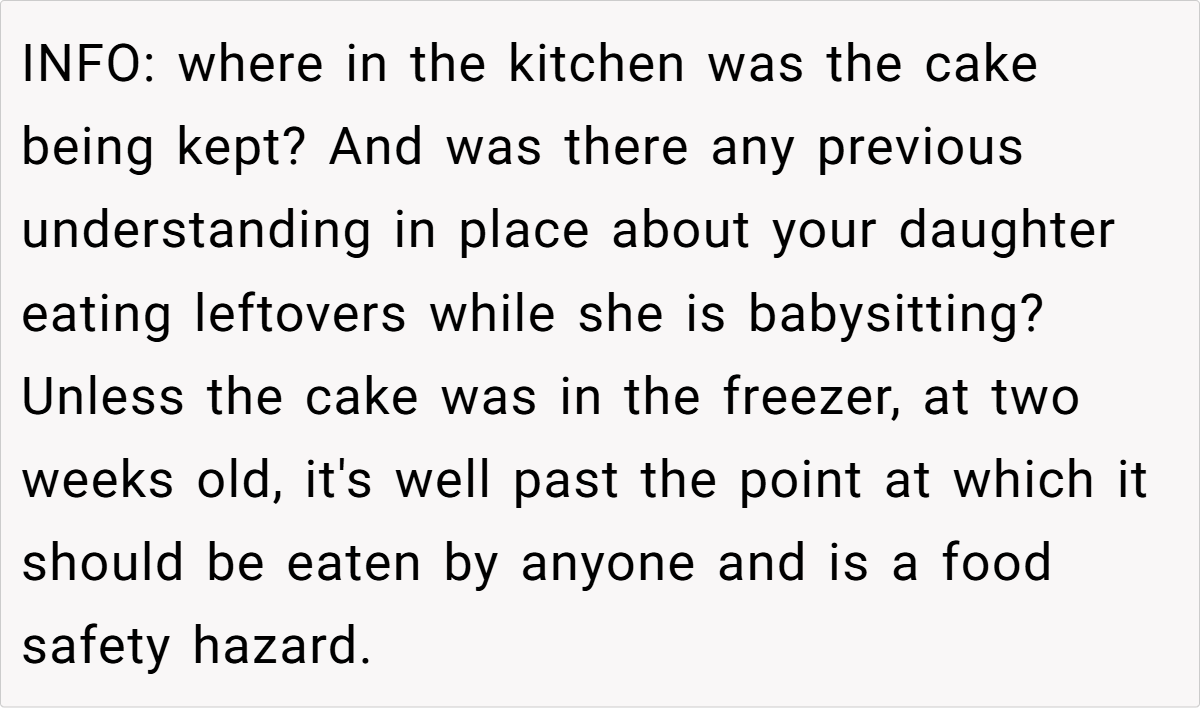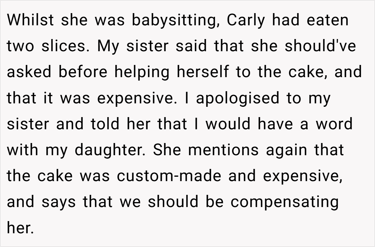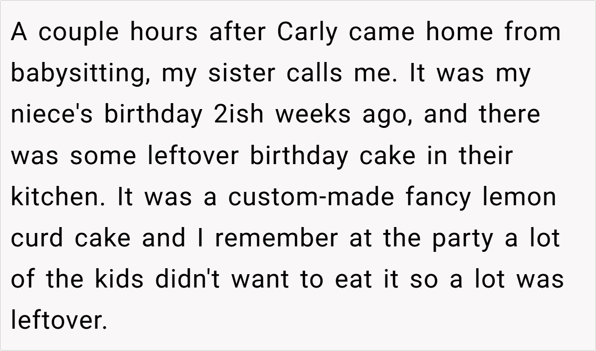 The incident unfolded when her daughter, Carly (17), who often earns extra cash by babysitting her cousins, helped herself to two slices of a custom-made, fancy lemon curd cake during a recent babysitting session. Although the cake had been meant for a birthday celebration—and plenty of it was available at the party—the slices ended up disappearing from the kitchen before anyone else could enjoy them.