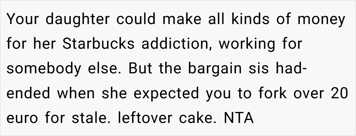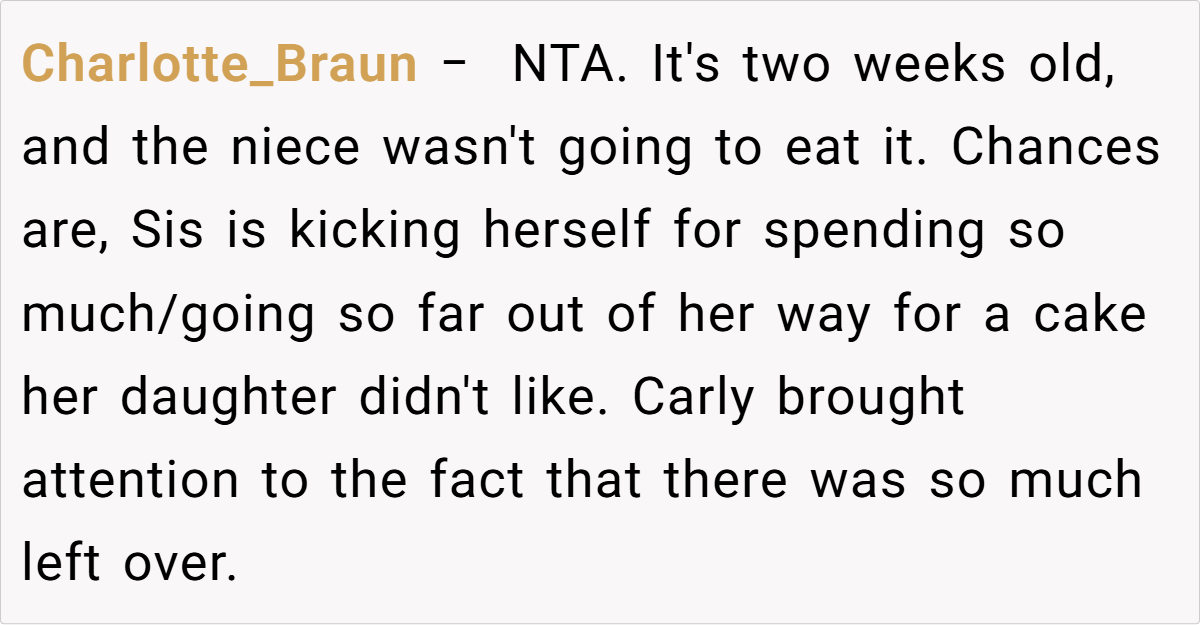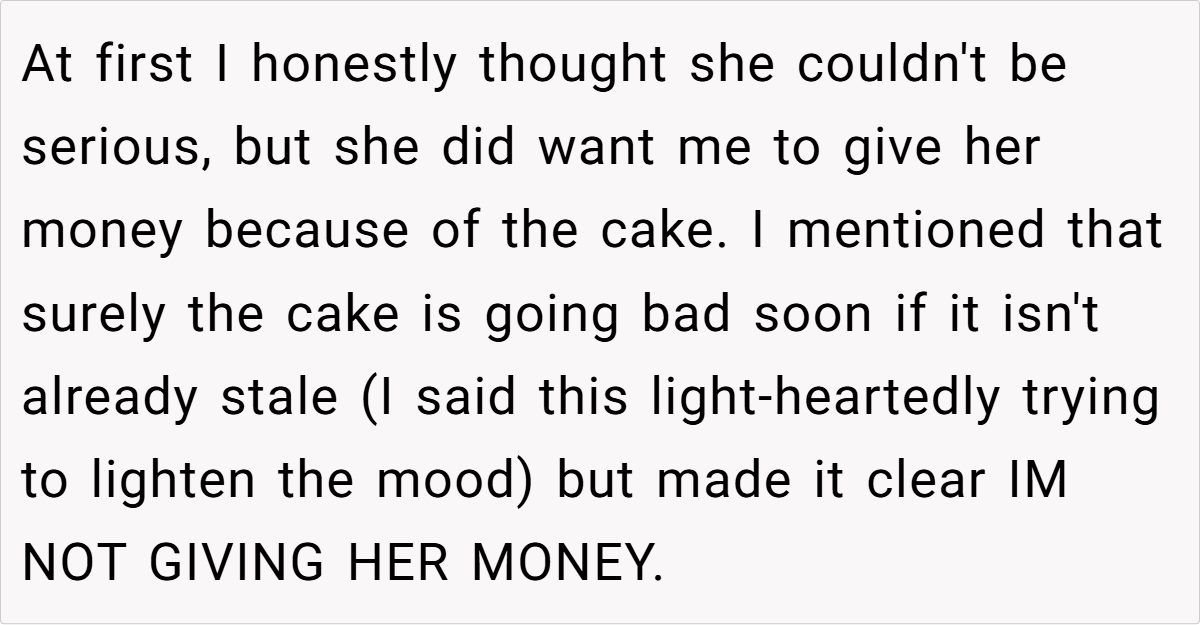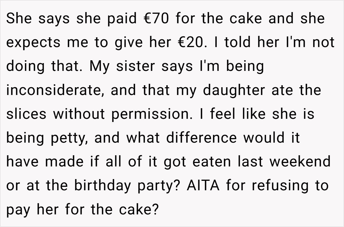 The fallout was swift. Carly’s aunt, who had spent €70 on the cake, was livid and demanded compensation for the missing slices. The single mom, aiming to keep the situation light yet firm, refused to pay the requested €20, arguing that the cake would have gone stale anyway. What began as a small act of indulgence spiraled into a heated debate about fairness, respect, and the sometimes-overlooked importance of asking before helping oneself.