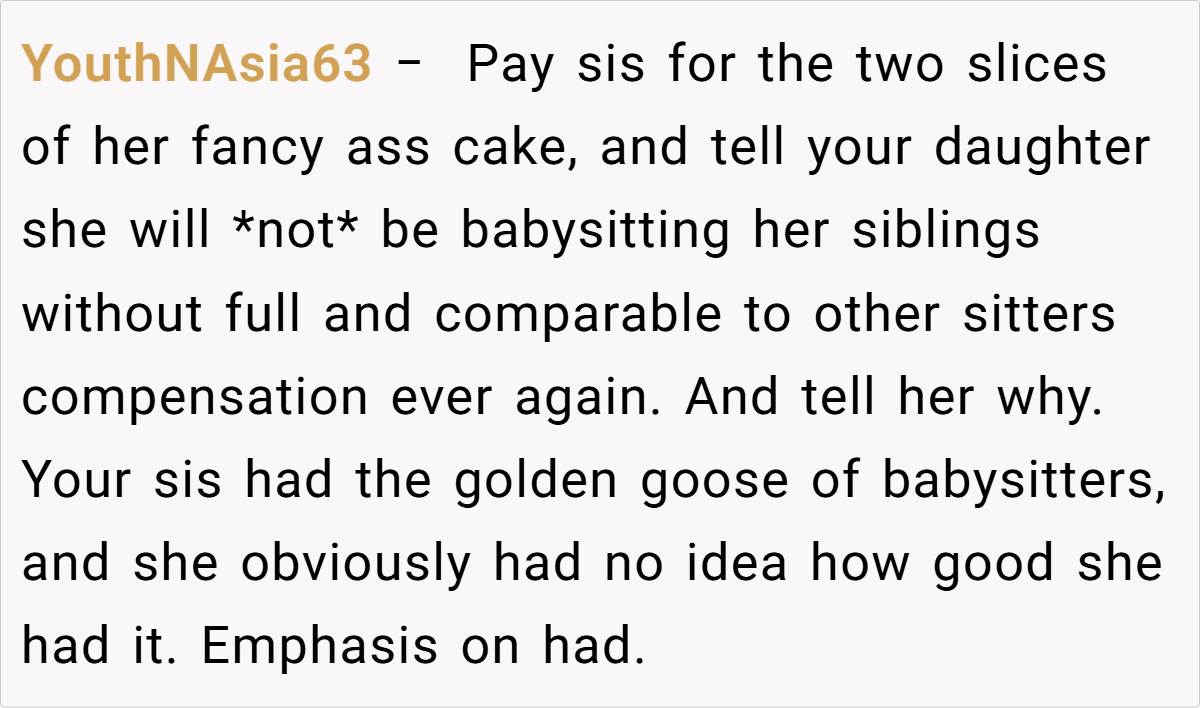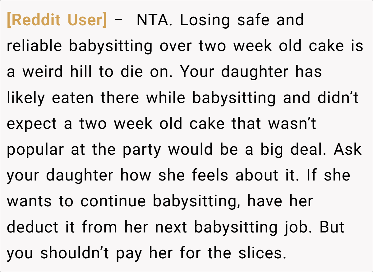 By not compensating for the cake, she hoped to convey that while it’s okay to help yourself occasionally, doing so without permission can lead to unintended expenses and hurt feelings. This approach, though seemingly strict, can serve as an important stepping stone for teenagers learning about accountability.