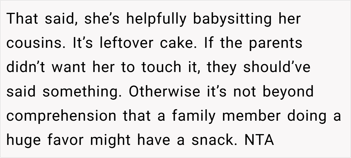 Some professionals also note that the context of such incidents matters greatly. While a slice of cake might seem trivial on its own, when it becomes emblematic of larger patterns of behavior, it can trigger deeper emotions. In this scenario, the aunt’s reaction underscores how financial investments in special occasions carry emotional weight, and the refusal to reimburse is seen not merely as a financial decision but as a stance on principle.