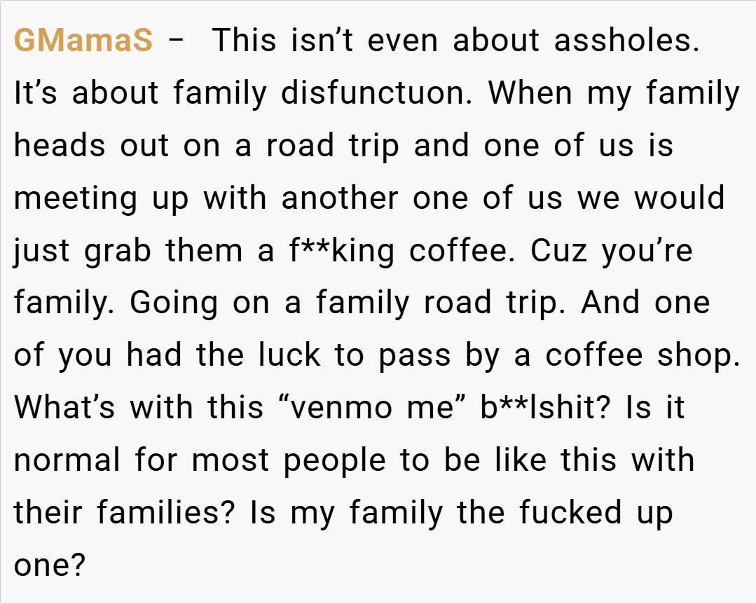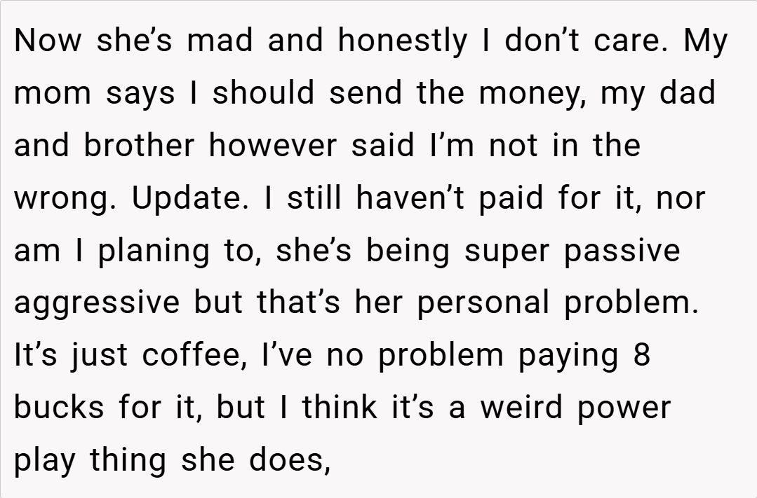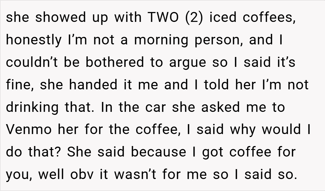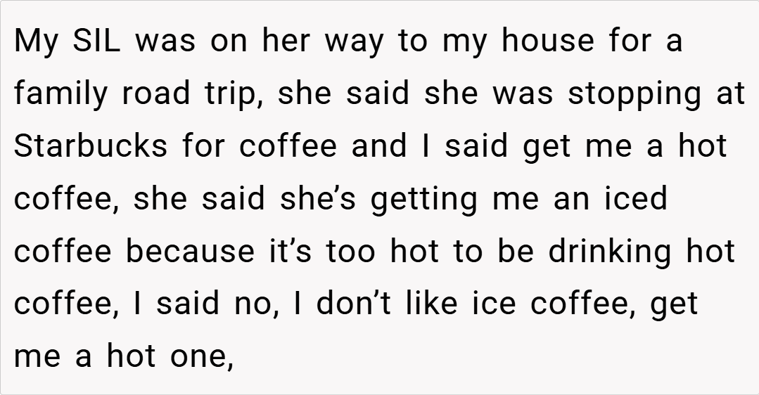You blink, mutter “I don’t like iced,” and suddenly you’re in a caffeine-fueled standoff over an $8 Venmo request. Welcome to a morning gone sideways, where coffee’s not just a drink—it’s a battleground. This isn’t your average sibling squabble; it’s a tale of stubbornness, petty power plays, and a family split down the middle. Our Redditor’s holding firm—no cash for a drink she didn’t want—while her SIL’s simmering like an oversteeped latte. Let’s stir the pot and see what’s brewing!
