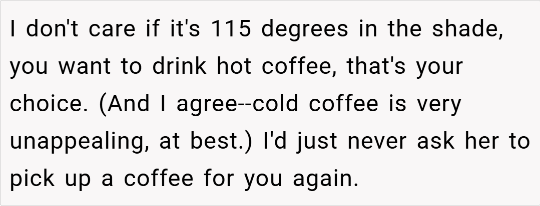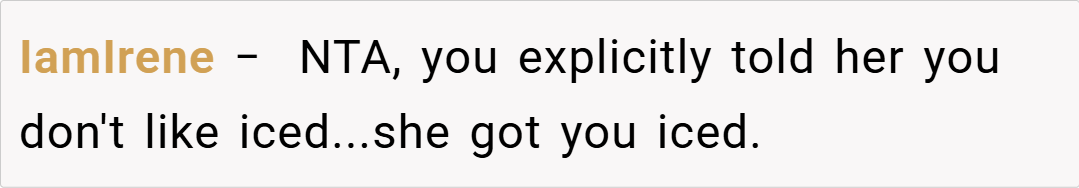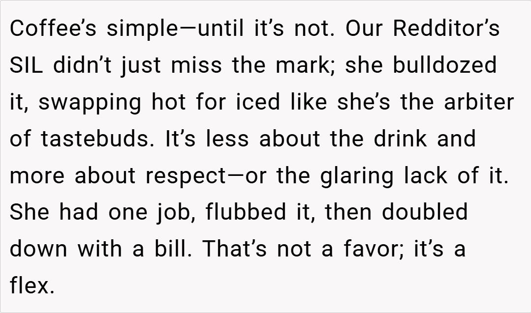 So, here’s the grind: a hot coffee request turned into an iced showdown, with family ties fraying faster than a cheap straw. Our Redditor’s not wrong to balk—paying for a drink you nixed is like tipping a chef for burning your meal. SIL’s power play flopped, and now it’s her mess to stew in. What’s your brew, readers? Ever had someone steamroll your ask, then bill you for it? How’d you handle the heat—or would you? Spill your beans below; we’re caffeinated for it!