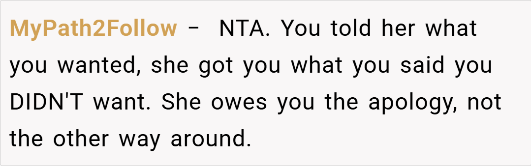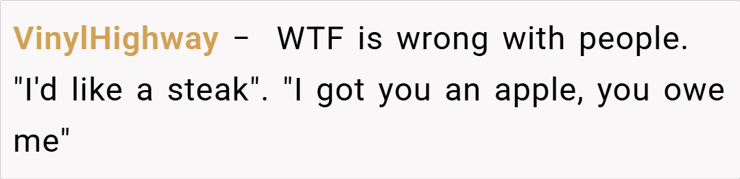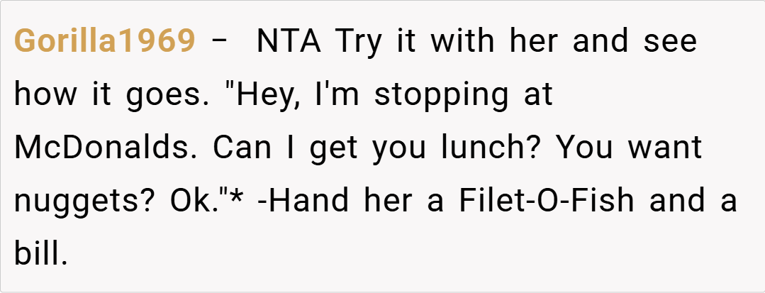 The Reddit crew brewed up some fire: “She got you an apple instead of a steak and wants cash? Nope!” one jabbed, while another quipped, “Hand her a Filet-O-Fish next time—see how she likes it.” It’s a resounding NTA—Not The Asshole—with a dash of “SIL’s a control freak.” These zingers hit hard, but do they perk up in real life? Let’s sip on that.