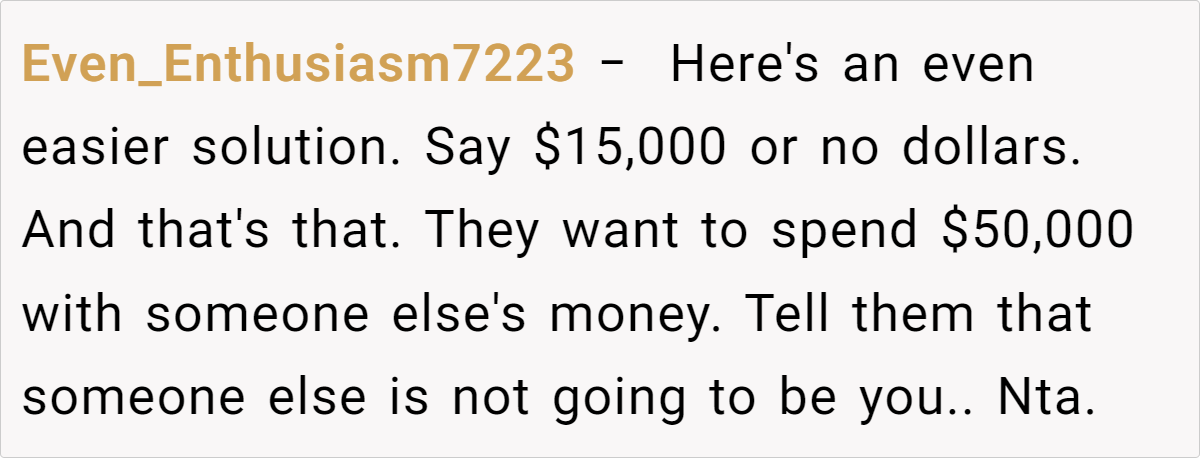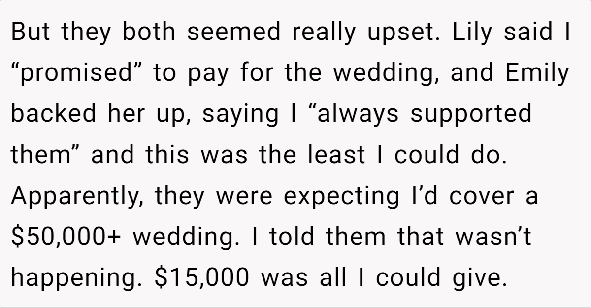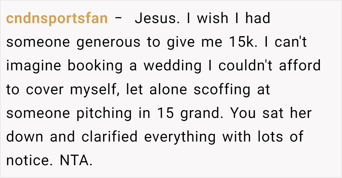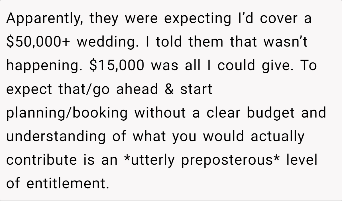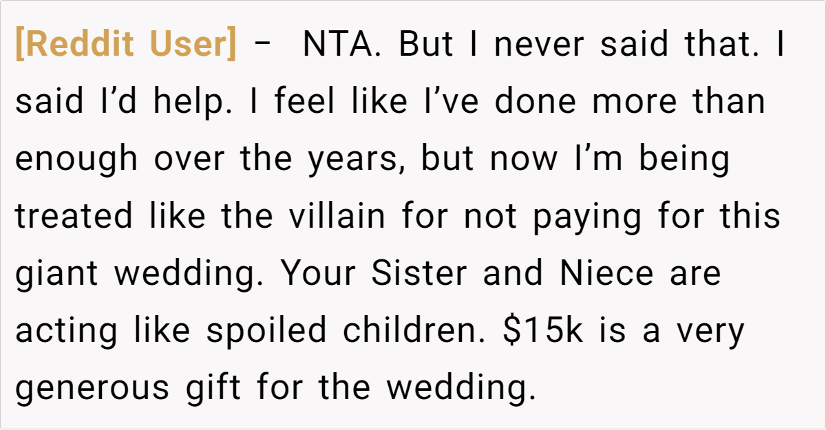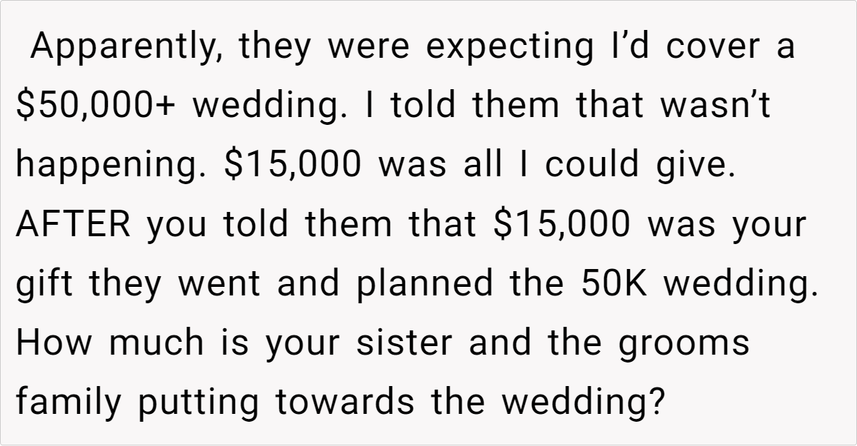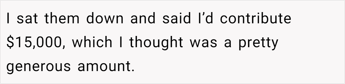 The OP appears to have been generous while still setting a personal limit of $15,000. His willingness to help with wedding expenses, though clearly defined in his mind, was assumed by his family to be a promise for a much larger sum. This miscommunication underscores the importance of discussing financial boundaries upfront. When expectations differ, even well-intentioned support can quickly become a catalyst for conflict.
