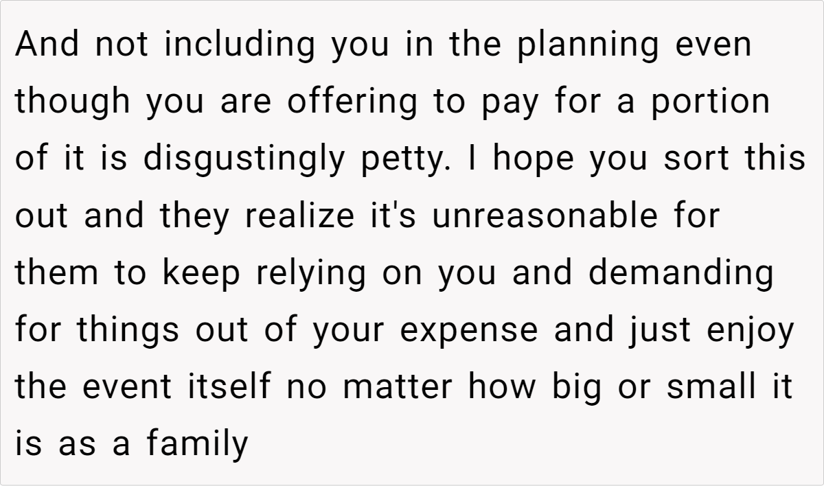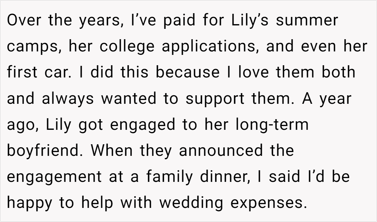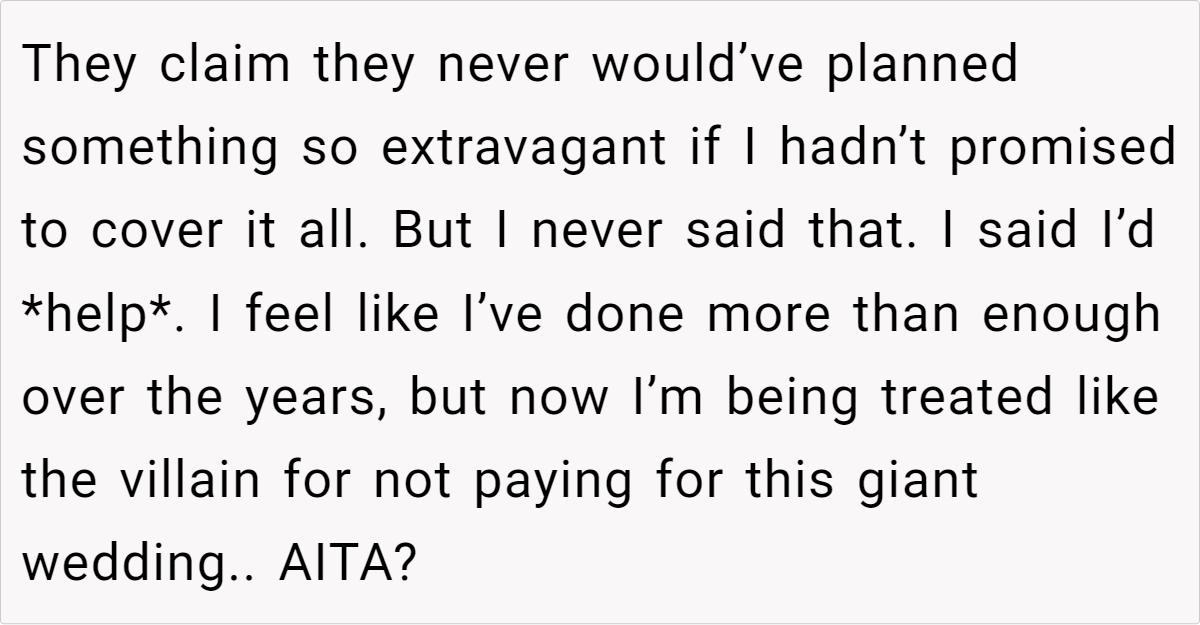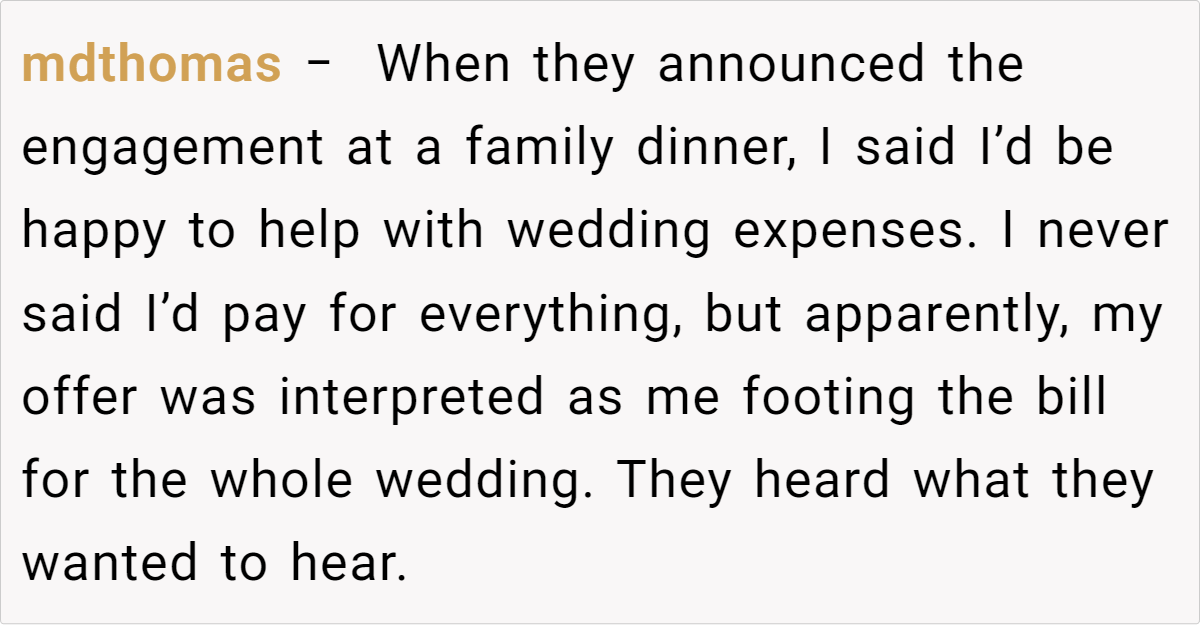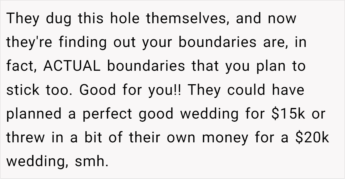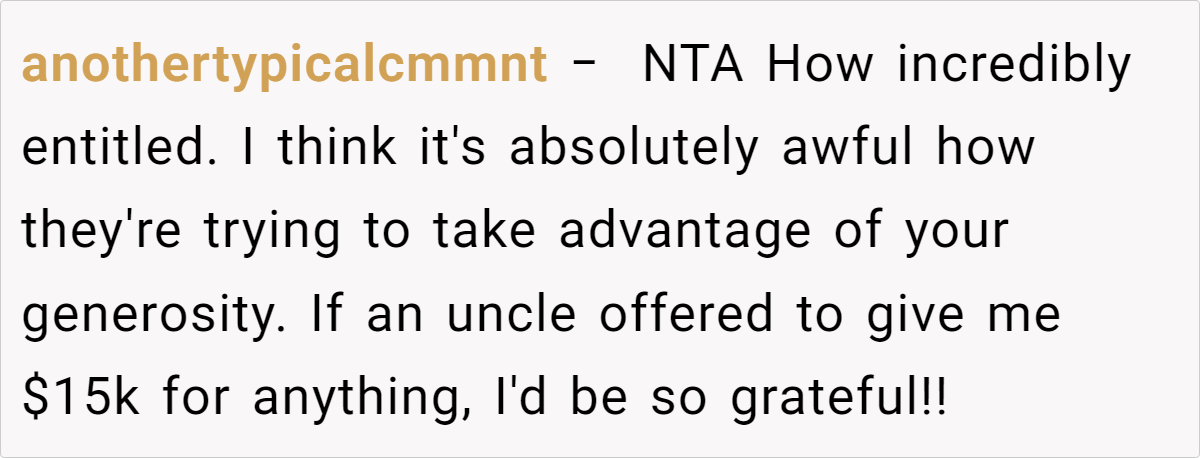 The OP appears to have been generous while still setting a personal limit of $15,000. His willingness to help with wedding expenses, though clearly defined in his mind, was assumed by his family to be a promise for a much larger sum. This miscommunication underscores the importance of discussing financial boundaries upfront. When expectations differ, even well-intentioned support can quickly become a catalyst for conflict.