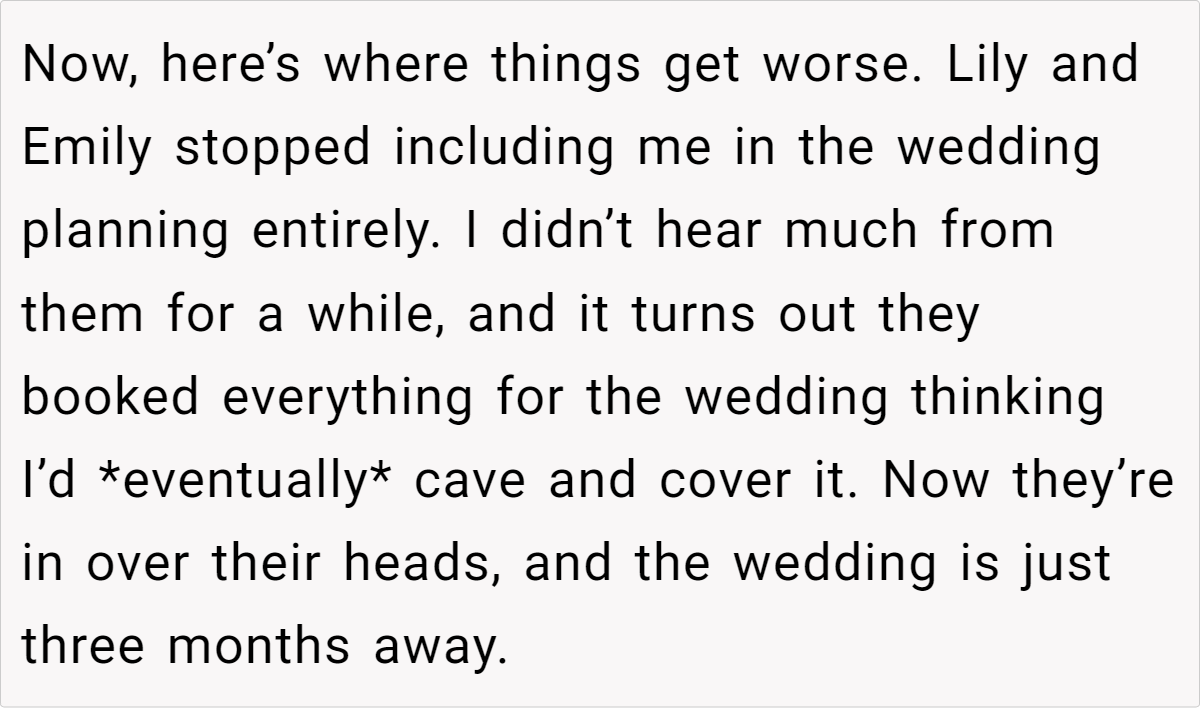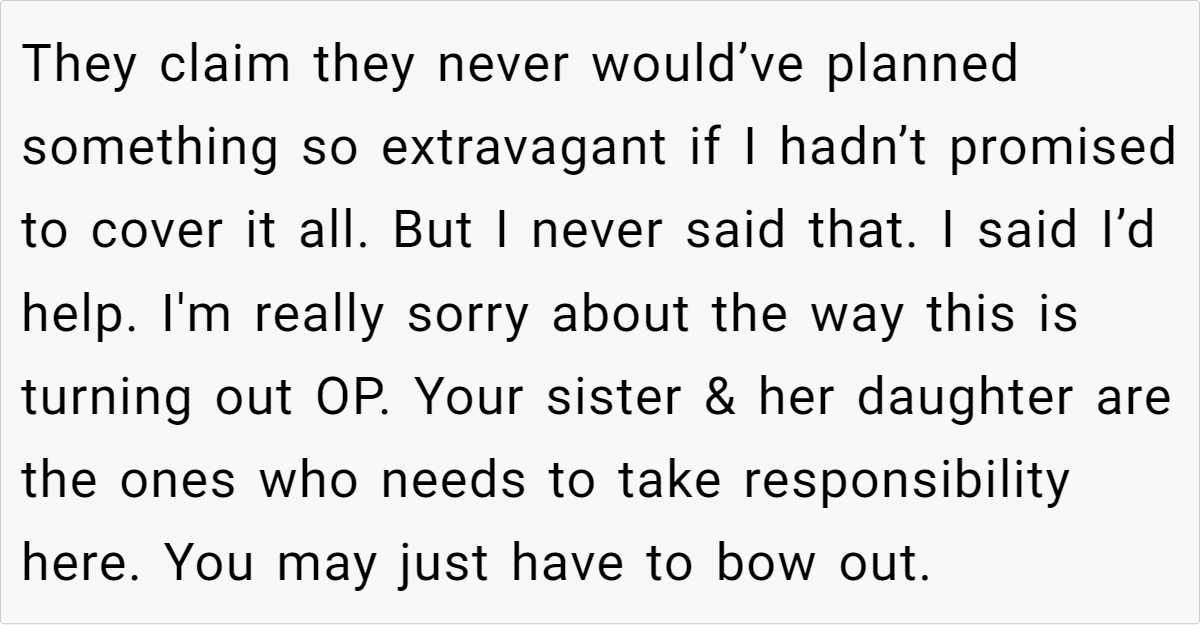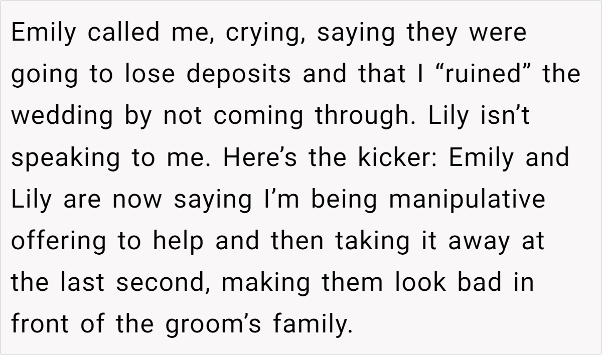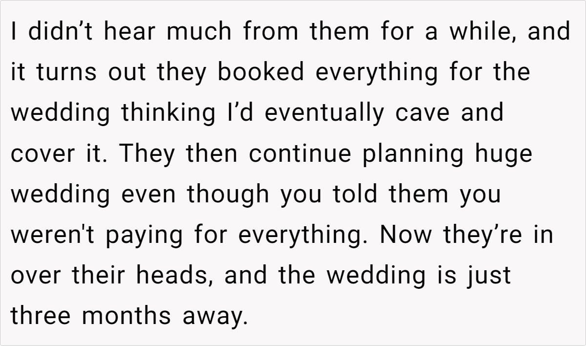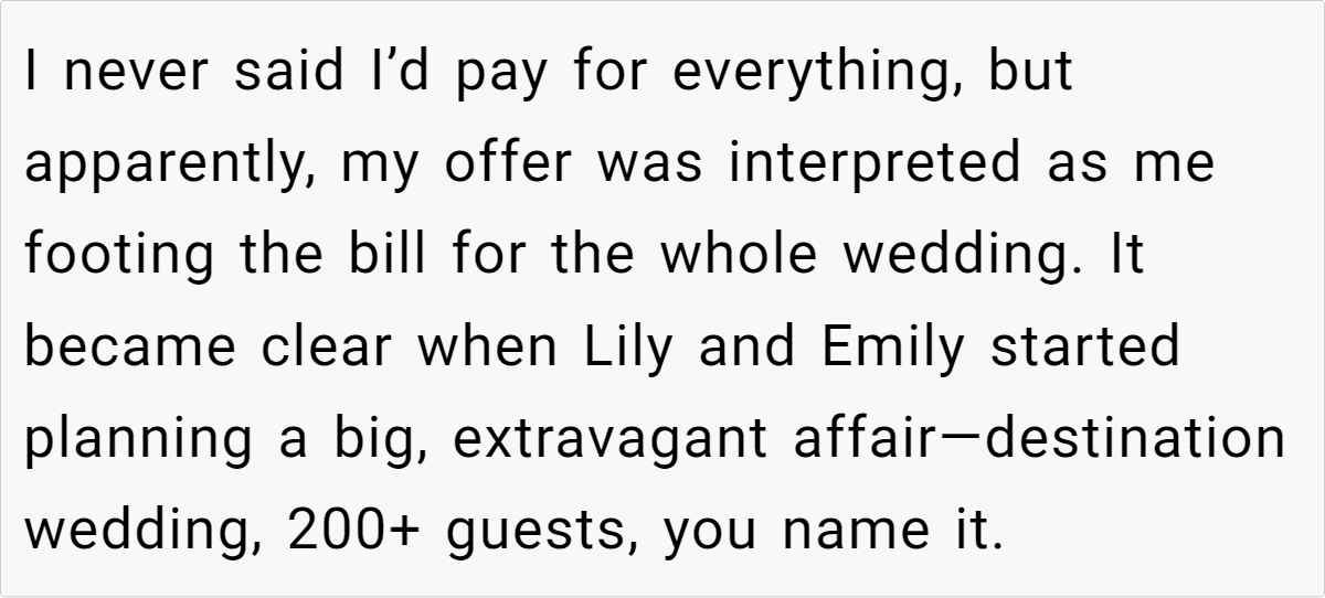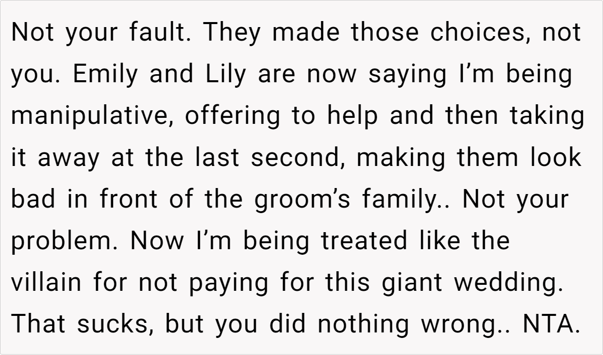 The OP appears to have been generous while still setting a personal limit of $15,000. His willingness to help with wedding expenses, though clearly defined in his mind, was assumed by his family to be a promise for a much larger sum. This miscommunication underscores the importance of discussing financial boundaries upfront. When expectations differ, even well-intentioned support can quickly become a catalyst for conflict.