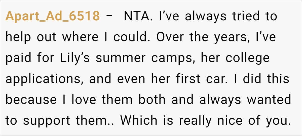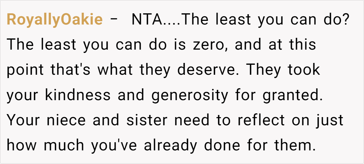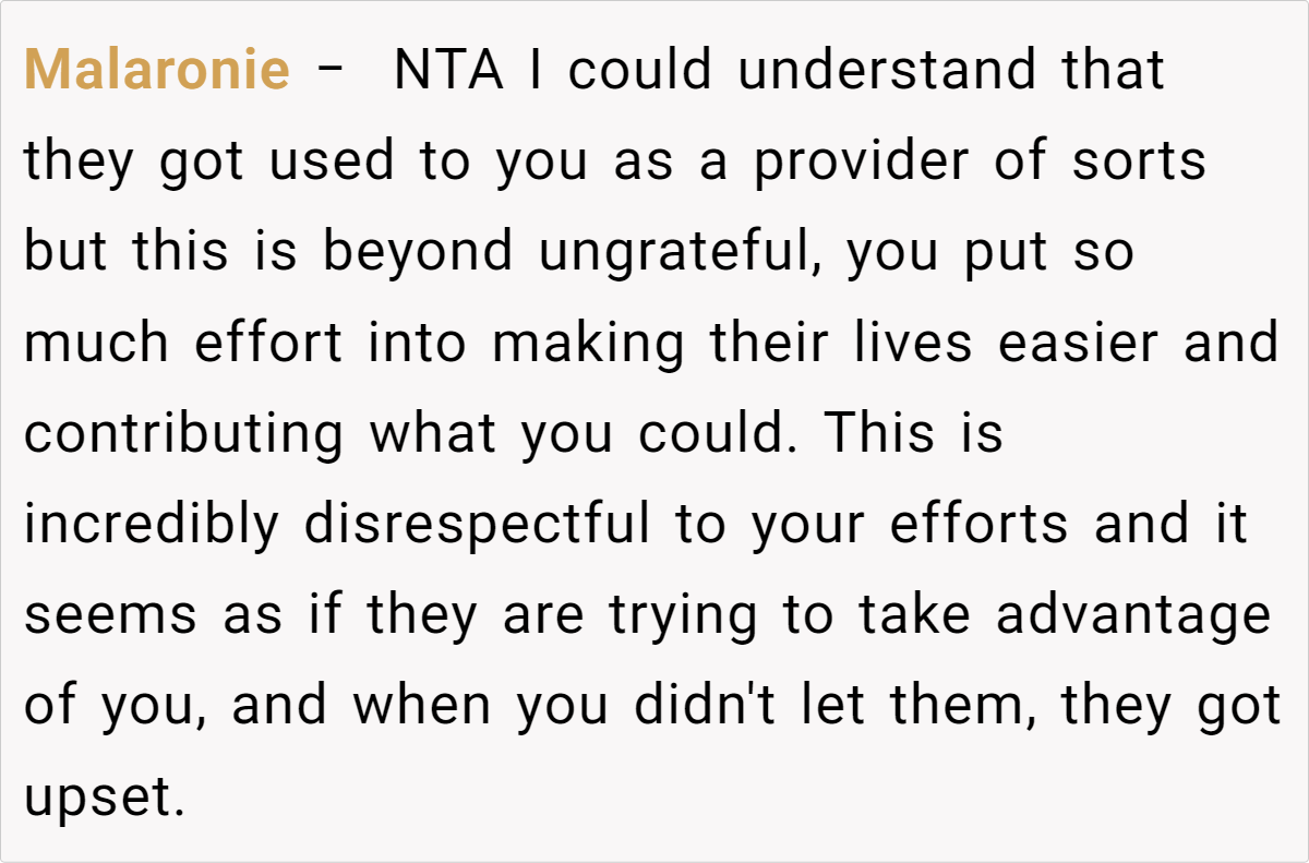 Here are some hot takes from the Reddit community—candid, humorous, and unfiltered. [comment block] These popular opinions capture the sentiment that while generosity is commendable, it must come with clear, mutual understanding. They reflect a mix of empathy and pragmatic advice, inviting readers to consider how they might navigate similar situations in their own lives. Do these opinions truly mirror the reality of family dynamics, or are they just bold takes in an online forum?