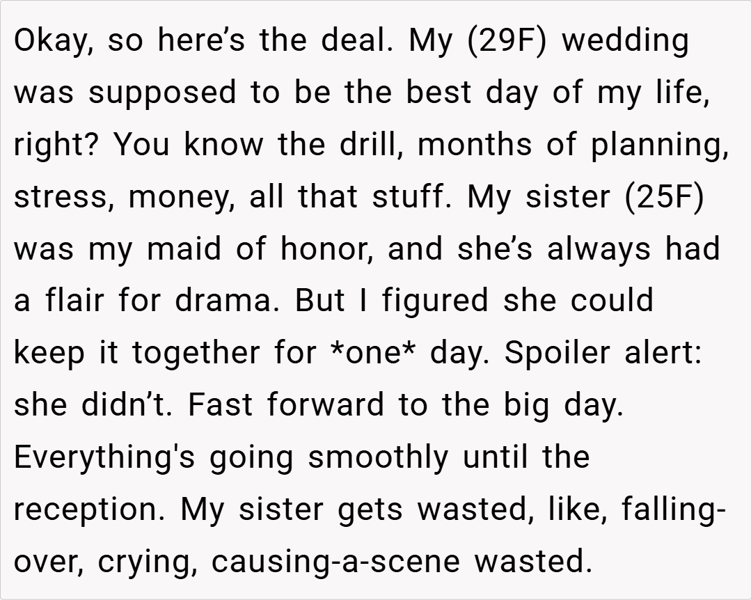 Weddings are meant to be a celebration of love, joy, and new beginnings—but sometimes, family drama can turn the happiest day into a living nightmare. For our 29-year-old narrator, the wedding day she dreamed of transformed into a battleground of emotional fireworks, thanks to her 25-year-old sister, who served as maid of honor.