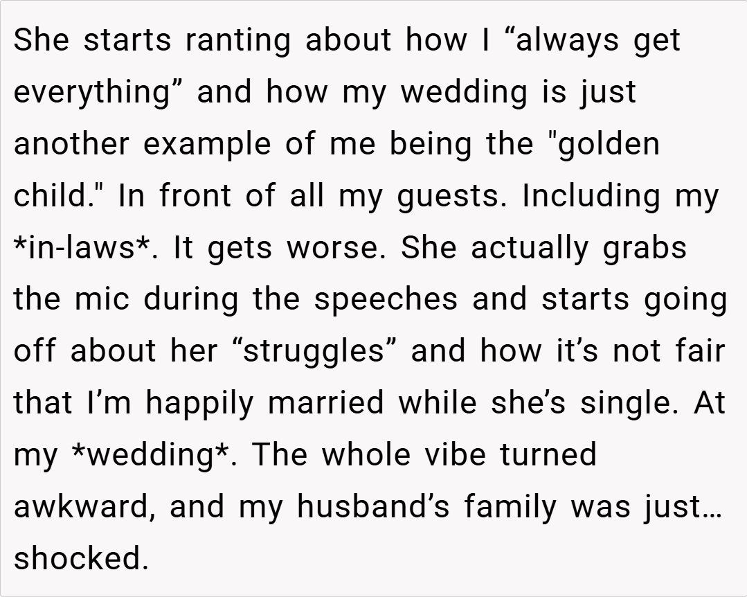 When someone consistently undermines a celebration meant to honor another person’s happiness, it not only hurts that individual but can create lasting fissures within the family.” [] Taking a closer look, the sister’s actions—getting heavily intoxicated, seizing the microphone, and launching into a tirade about her own struggles—reflect underlying issues that likely extend beyond a one-time lapse in judgment.