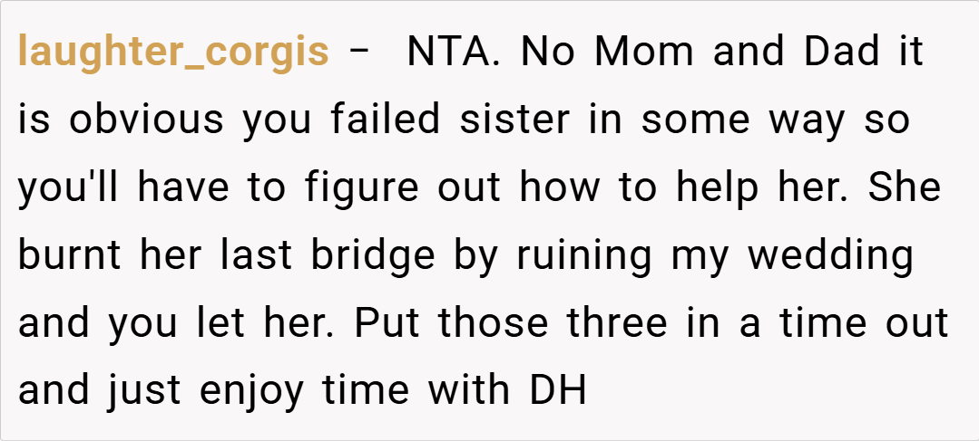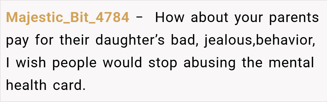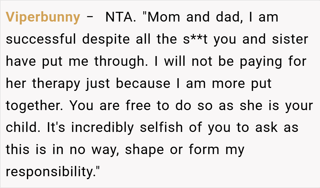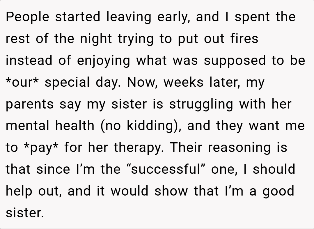 At the heart of this heated debate lies the question of where to draw the line between compassion and accountability. While therapy is an essential resource for personal growth and healing, should it be provided as a default safety net even when someone’s actions have caused significant harm to others? Our narrator’s refusal to pay for her sister’s therapy is a stand against rewarding behavior that disrupted her wedding and deeply wounded her.