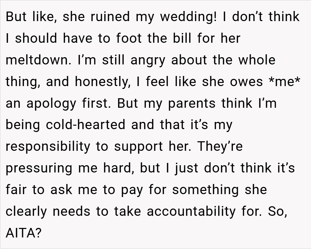‘ AITA for refusing to pay for my sister’s therapy after she ruined my wedding?’