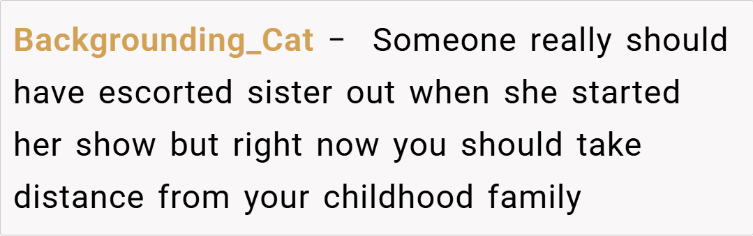 When family members overstep boundaries during significant life events, the resulting emotional damage can run deep. In this case, the sister’s behavior on the wedding day was not only disruptive but also deeply disrespectful to the bride and her new family. Relationship and family dynamics expert Dr. Susan Johnson explains, “It is crucial for individuals to take responsibility for their actions, especially when those actions disrupt significant life milestones.