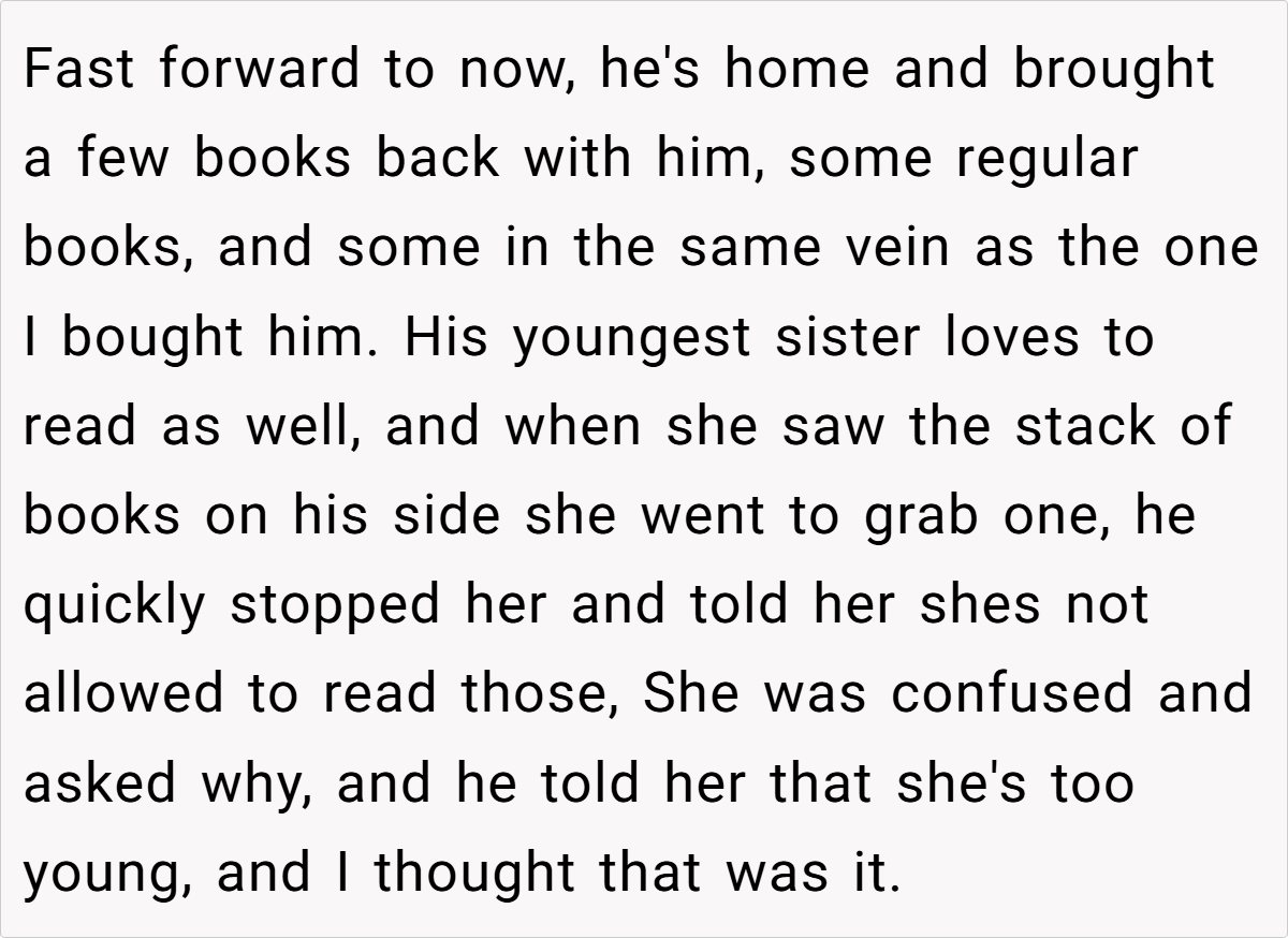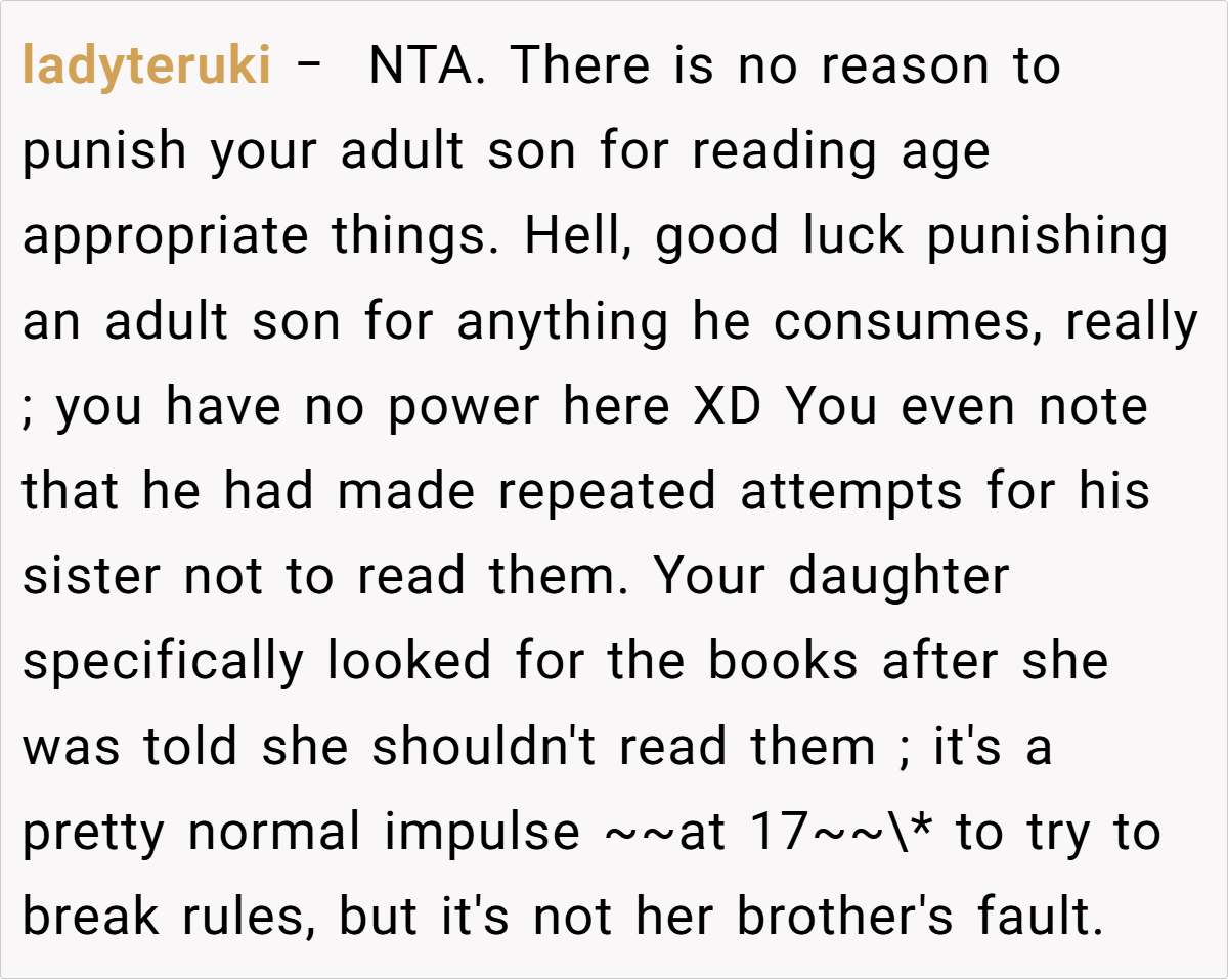 The father, however, firmly believes that his adult son should be allowed to choose what he reads. He points out that the son even took steps to secure his books after the first incident, making it clear that the issue is not the reading material itself but the violation of his privacy by his daughter. This story invites us to consider the delicate balance between respecting an adult child’s autonomy and ensuring that younger family members are shielded from content not meant for them.