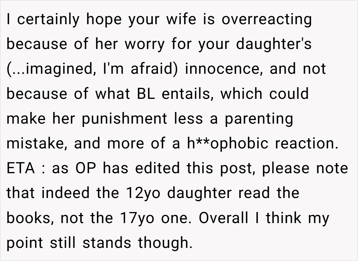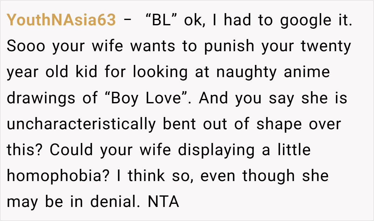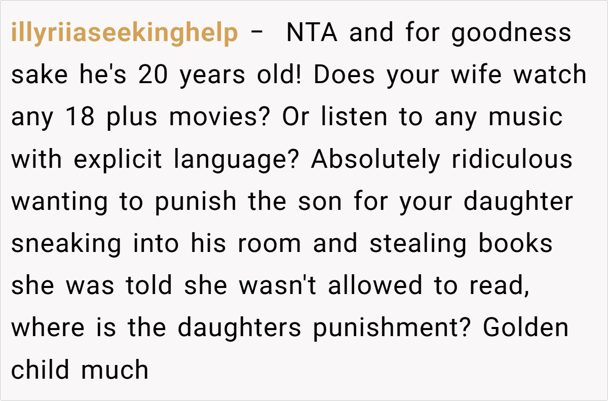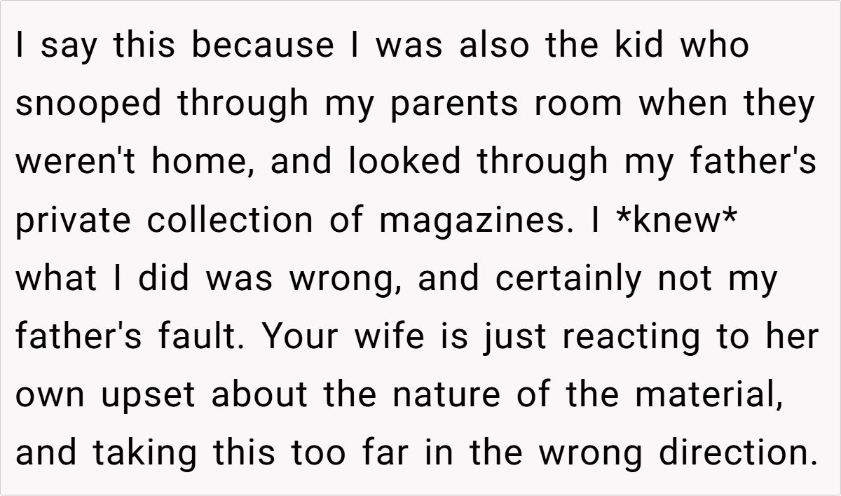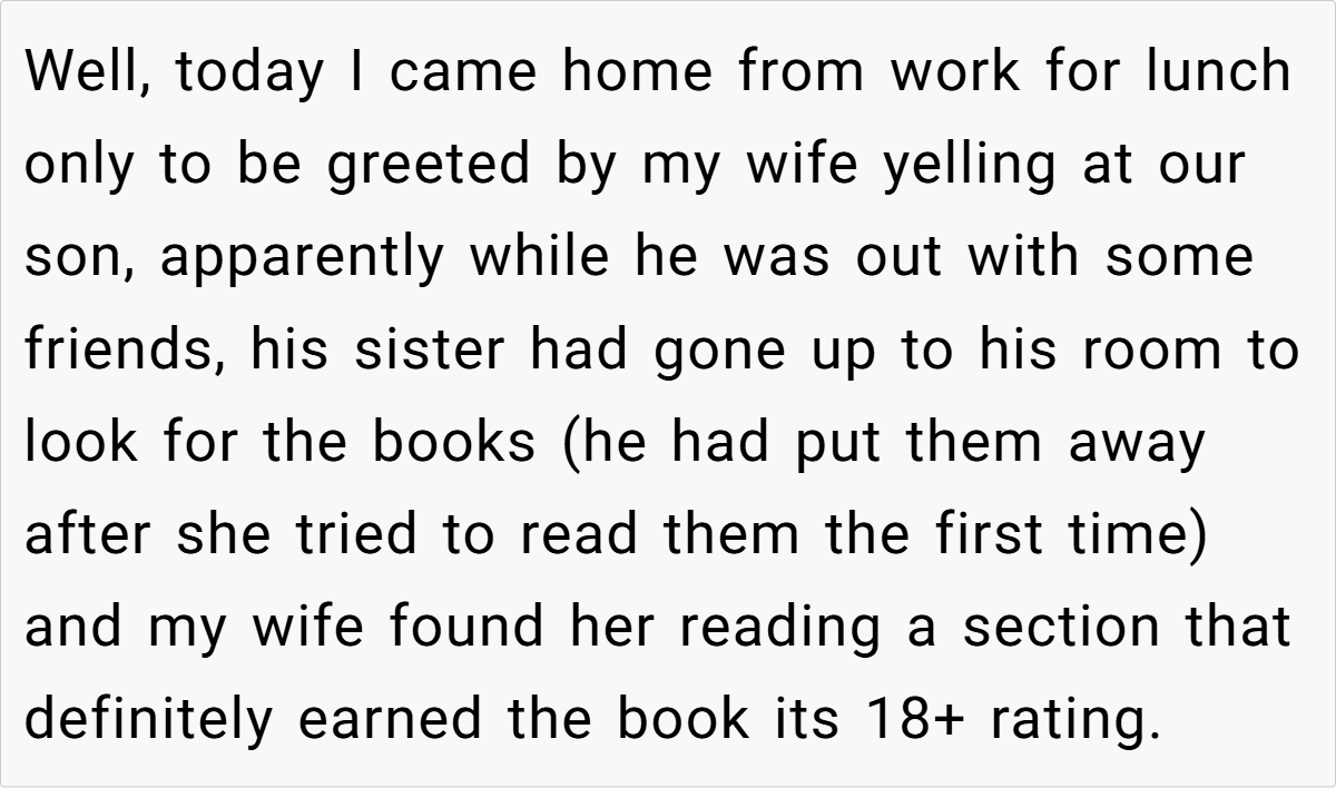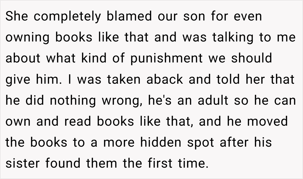 While the son is well within his rights to explore adult material, a misunderstanding arose when his 12‑year‑old sister, curious and eager to read, ended up snooping through his private collection. The ensuing fallout saw his wife vehemently insisting on punishment for the son, arguing that his choice in reading material exposed their daughter to inappropriate content.