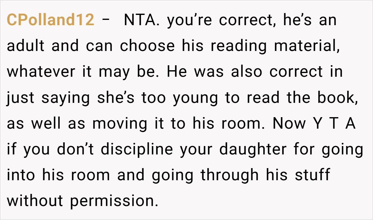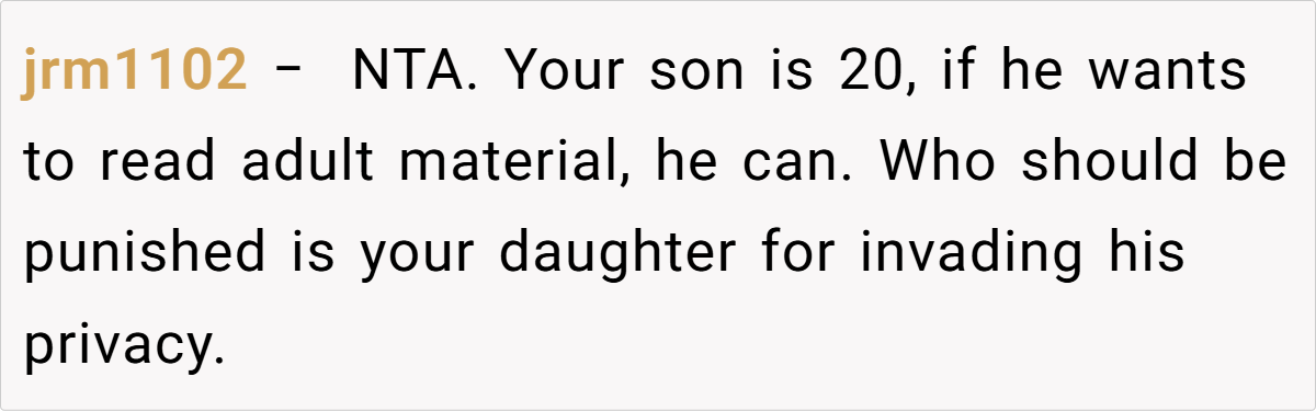 In this scenario, the son acted responsibly by explicitly informing his daughter that the mature material was off-limits and by securing his collection afterward. The real issue lies not in his choice of reading material, but in the daughter’s decision to disregard established boundaries by snooping into his private space. Experts suggest that when a minor violates clear instructions, the focus of any disciplinary action should be on addressing that behavior—not on punishing an adult for exercising his legal rights.