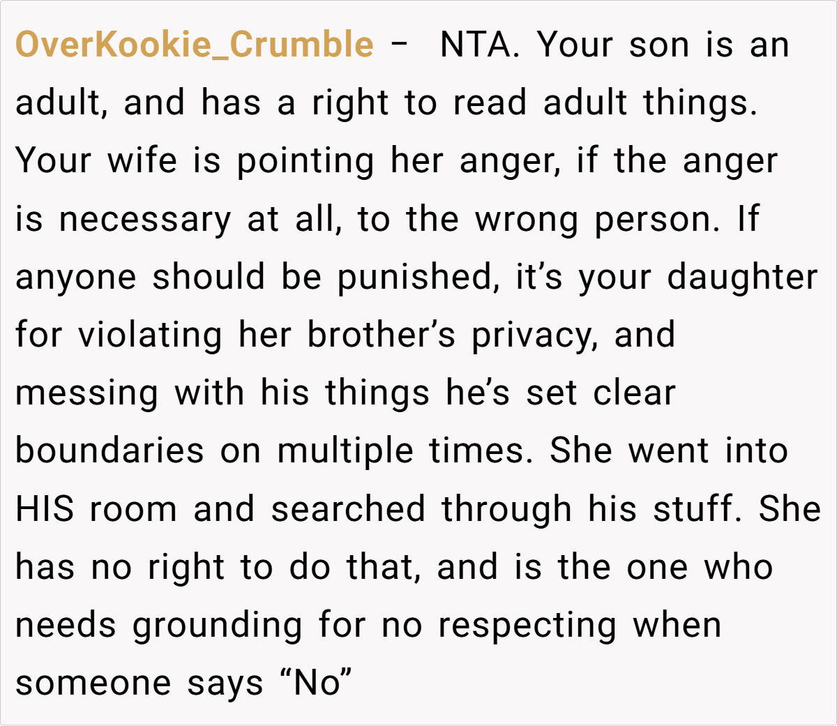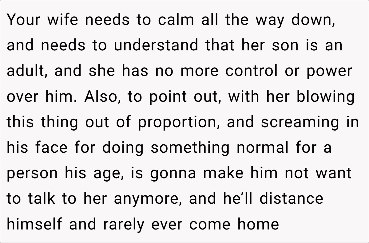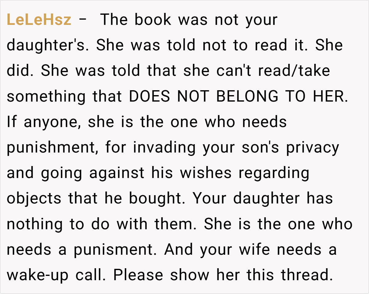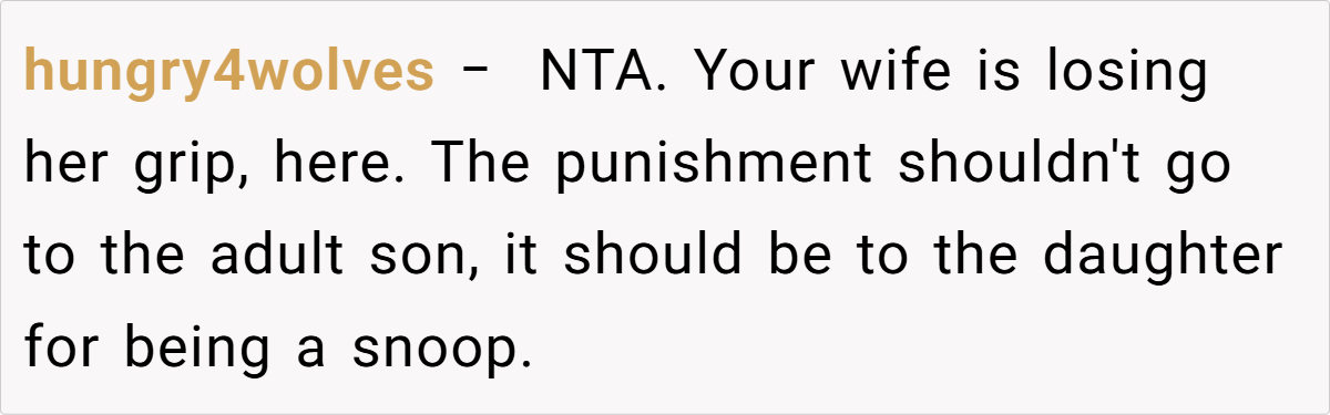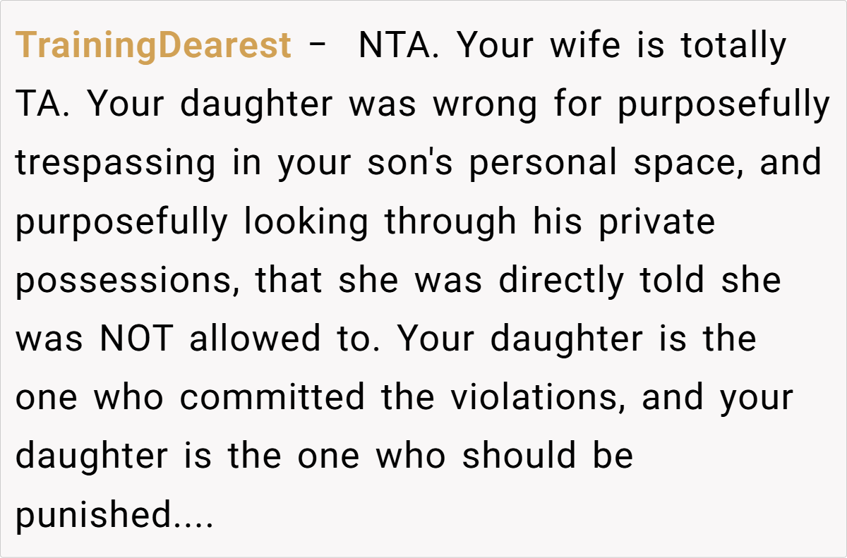 Many pointed out that the issue should be directed at the daughter for ignoring those boundaries rather than punishing an adult for his personal choices. The consensus was that any corrective action should focus on the daughter’s behavior—her deliberate snooping—rather than targeting the son, whose actions were both responsible and within his rights.