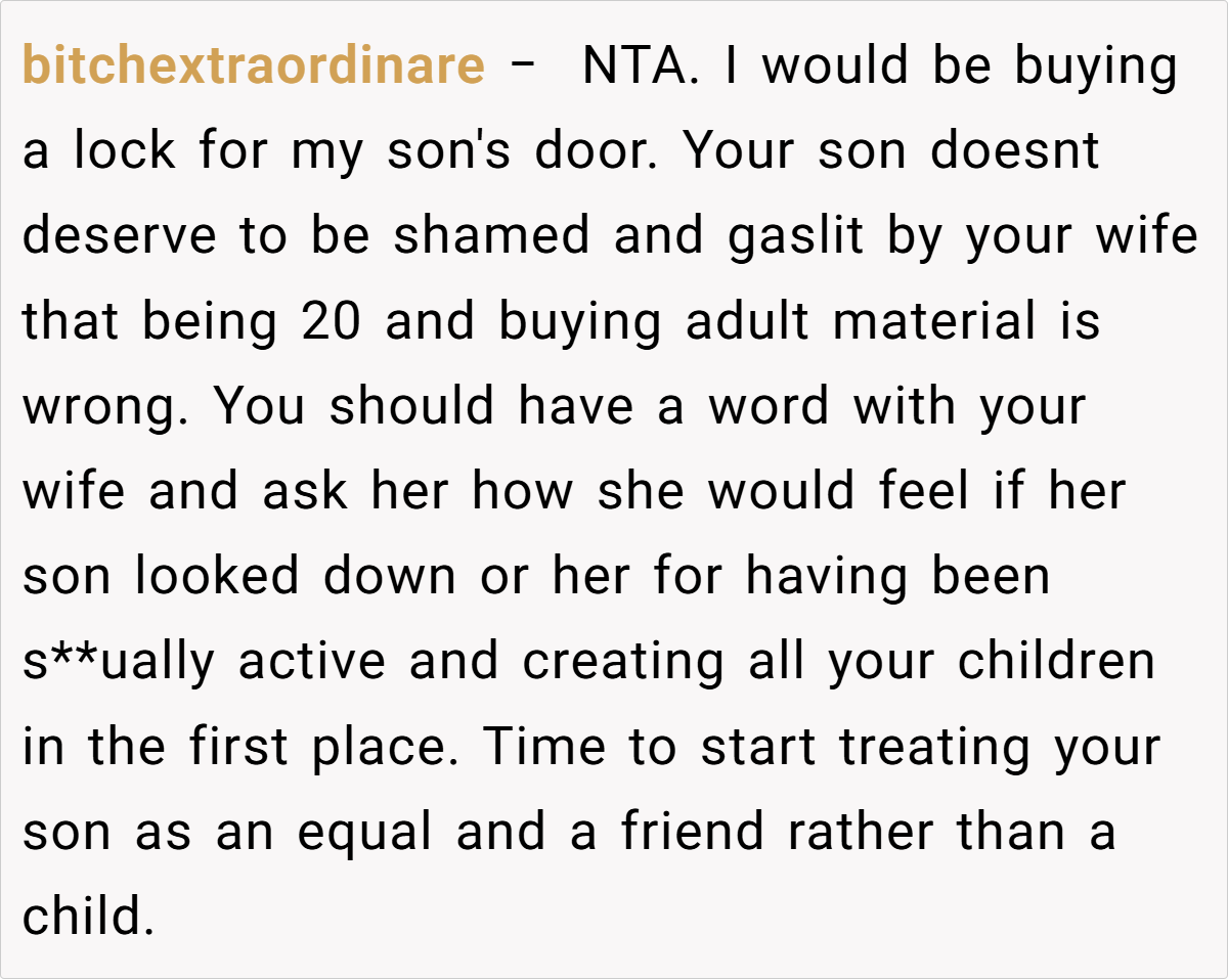 The Reddit community largely sided with the father’s perspective. Commenters emphasized that a 20‑year‑old is legally and morally entitled to own and enjoy adult material, especially when he has clearly communicated his boundaries.