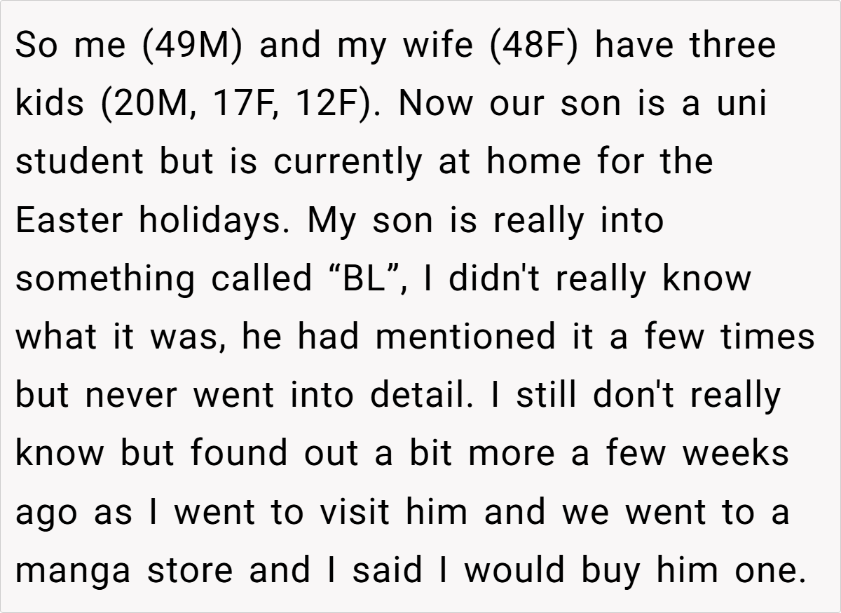 Family life is rarely simple, especially when adult independence collides with parental concerns about protecting minors. In this case, a 49‑year‑old father recounts a recent incident that has ignited a heated debate at home. His 20‑year‑old son, a university student on Easter break, is an avid reader of “BL” manga—a genre that carries an 18+ rating.