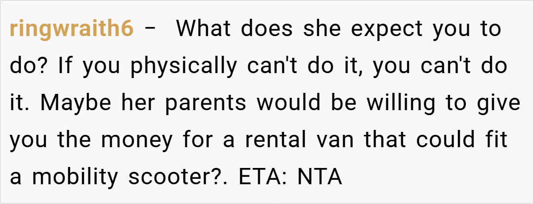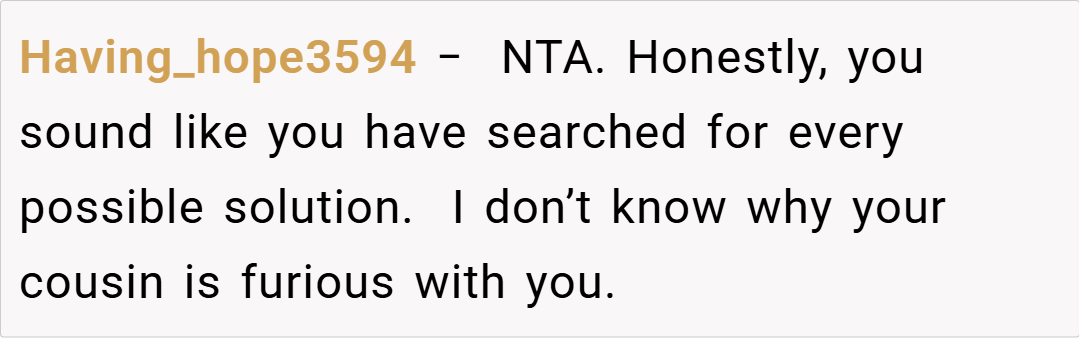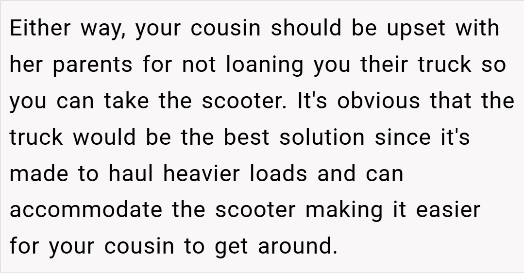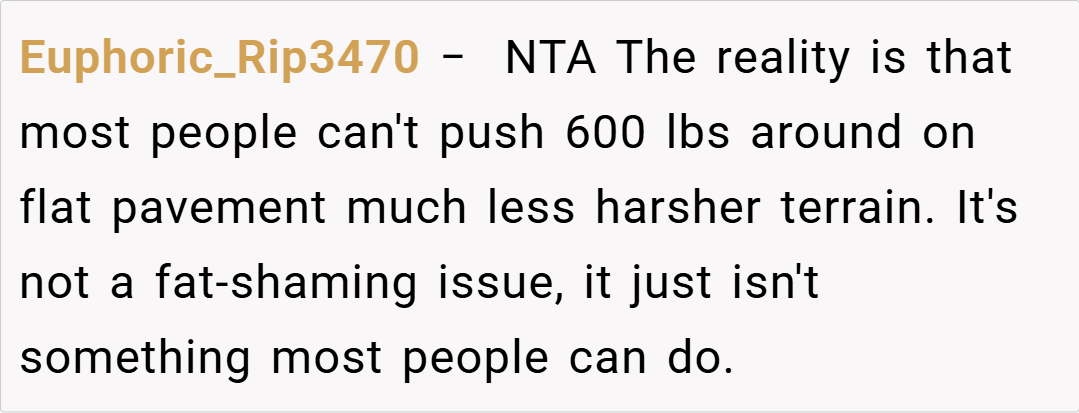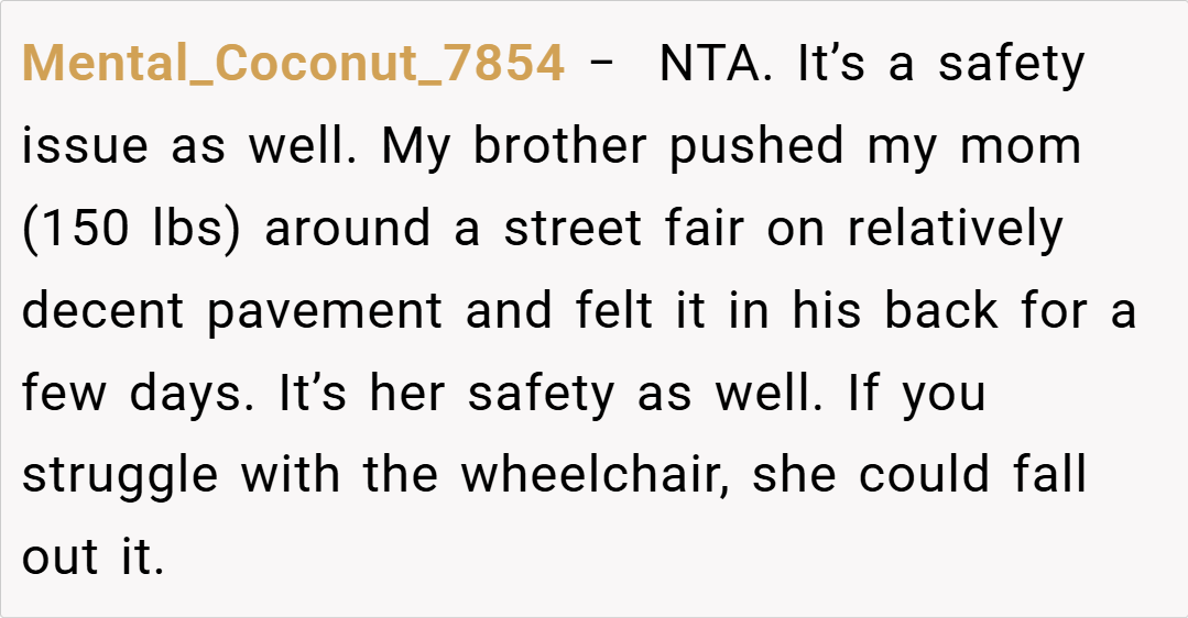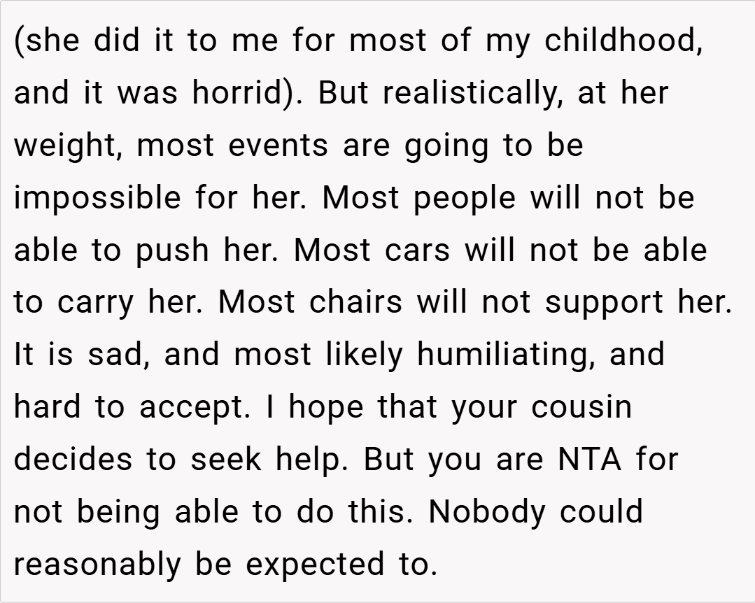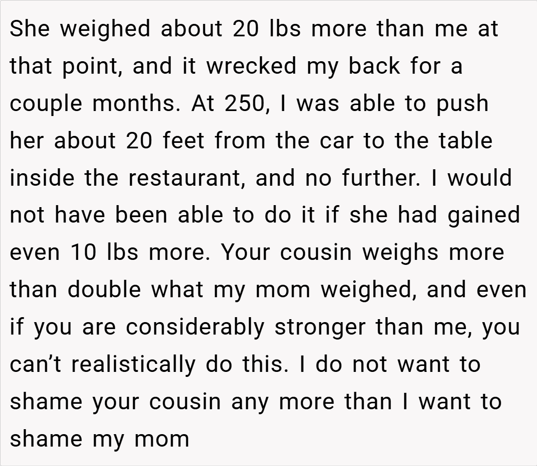 In summary, OP’s decision to refuse to push her cousin in a wheelchair stems from genuine concerns over safety and physical ability, not from a lack of care. While it’s understandable that her cousin might feel hurt or shamed by the refusal, the reality is that no one should be forced to perform a task that poses a serious risk of injury.