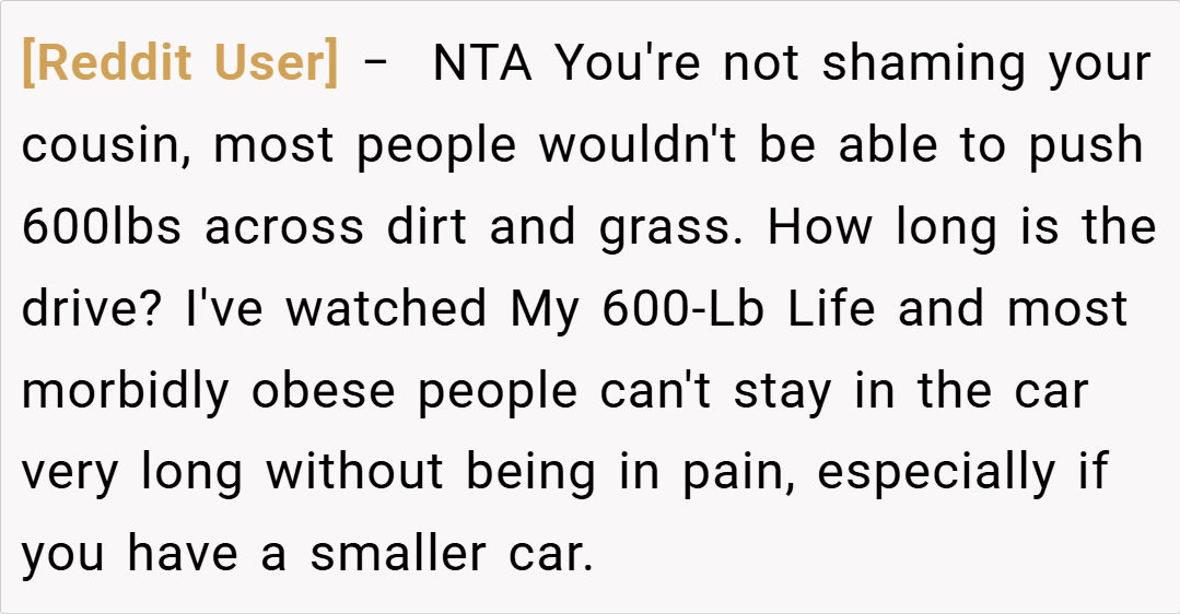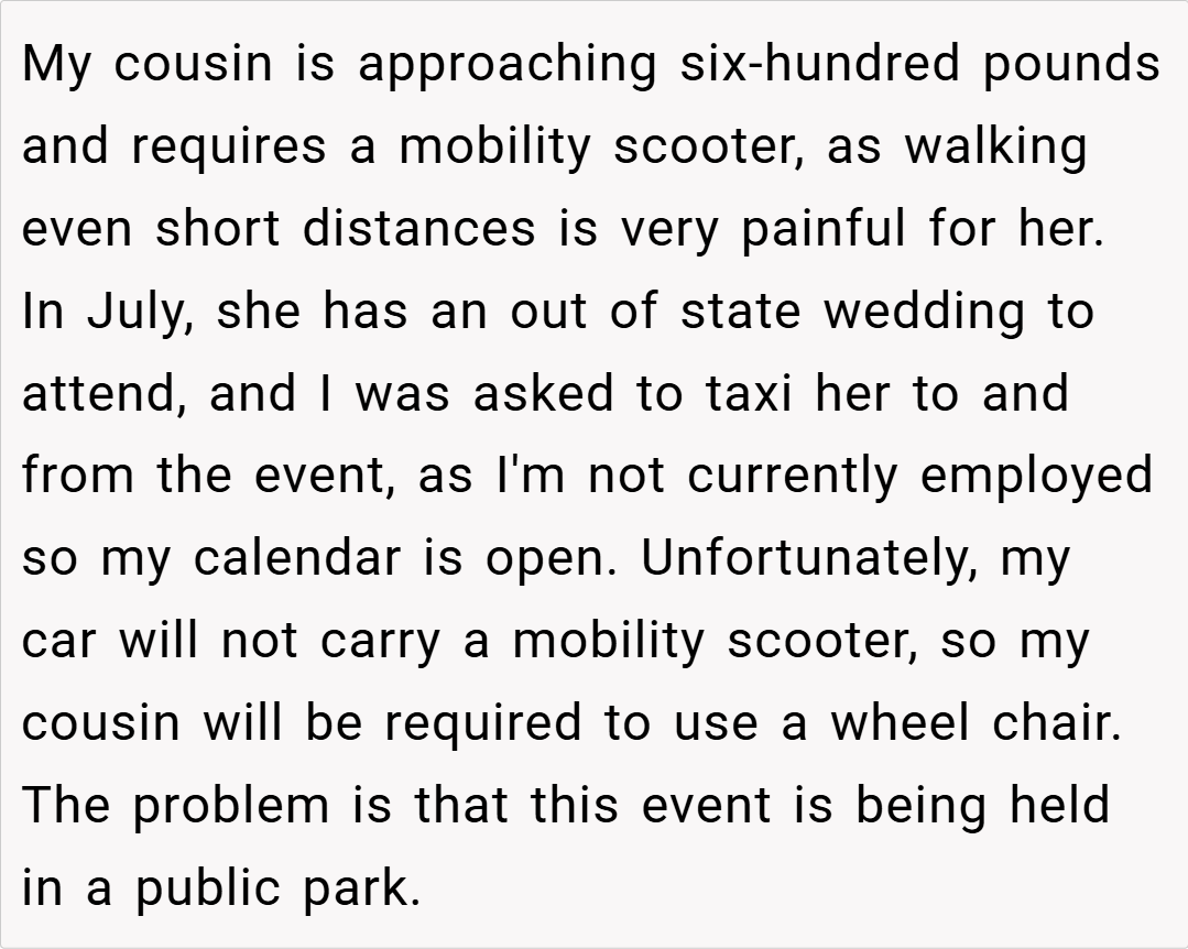 Family obligations can sometimes force us into challenging roles that test our physical limits and emotional boundaries. In this case, OP is faced with the request to push her obese cousin—who weighs nearly 600 pounds—in a wheelchair for an entire day so that her cousin can attend an out-of-state wedding held in a public park. Despite trying multiple solutions (from rental agencies to borrowing vehicles) and exploring all available options,