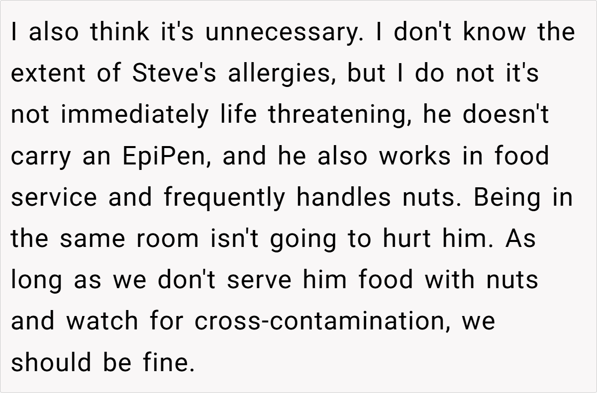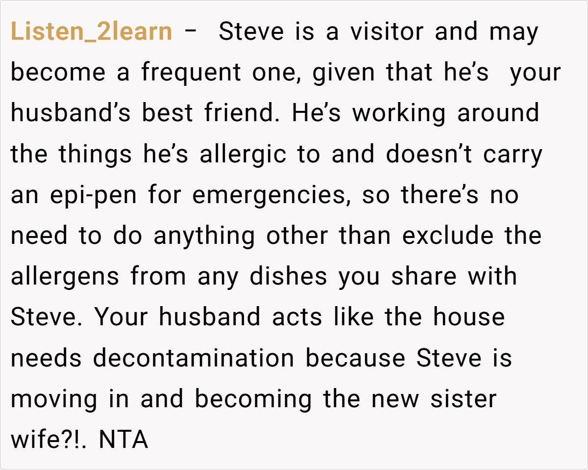 On one hand, the husband’s insistence on eliminating nuts from the house stems from a genuine concern for his childhood best friend’s wellbeing. Although the friend’s allergy may not be immediately life threatening—evidenced by his lack of an EpiPen and his daily exposure to nuts in food service—the fear of accidental exposure lingers.