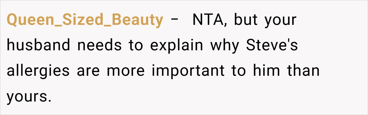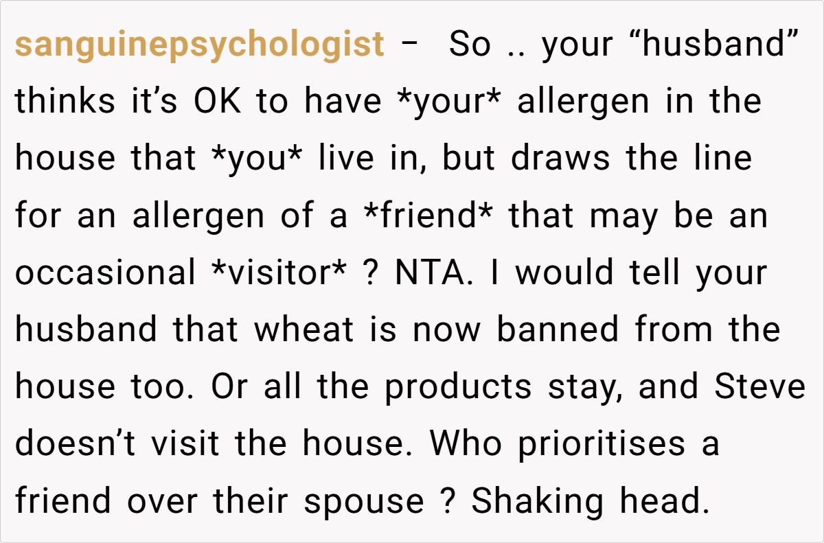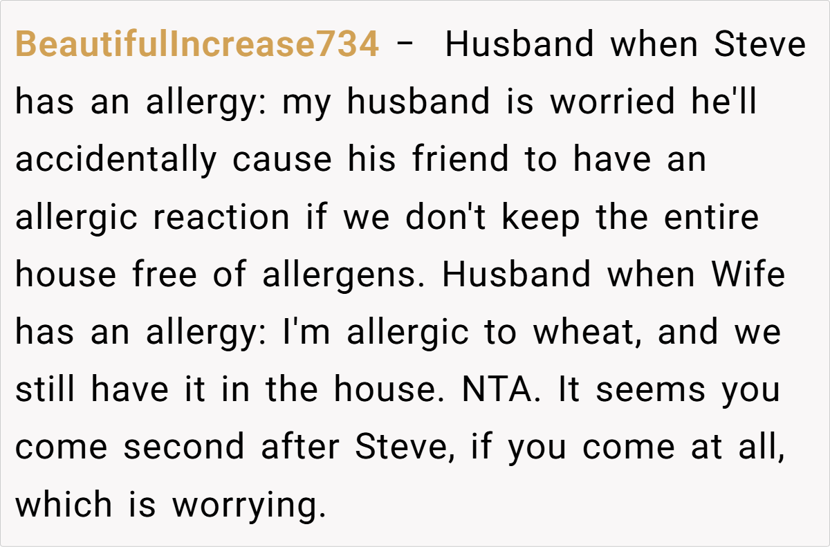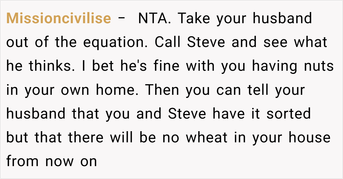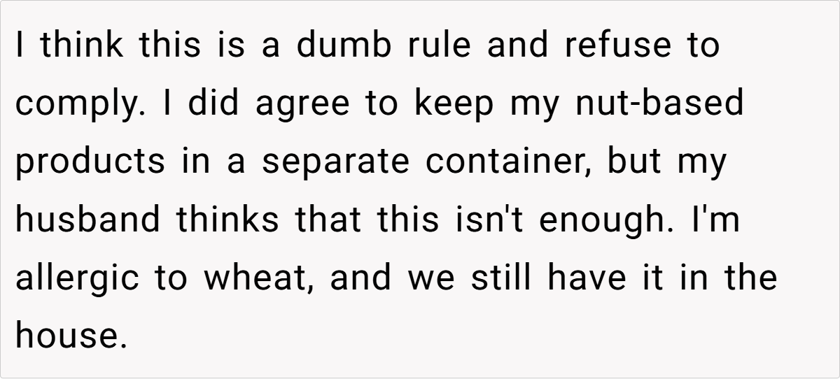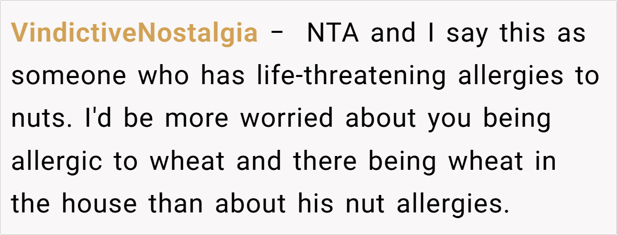 In contrast, the wife’s frustration highlights her desire to enjoy foods that are integral to her diet, such as nut-based products, while noting that her own allergy to wheat remains unmanaged. This juxtaposition calls for a deeper look at whose health takes precedence when lives and lifestyles intertwine.