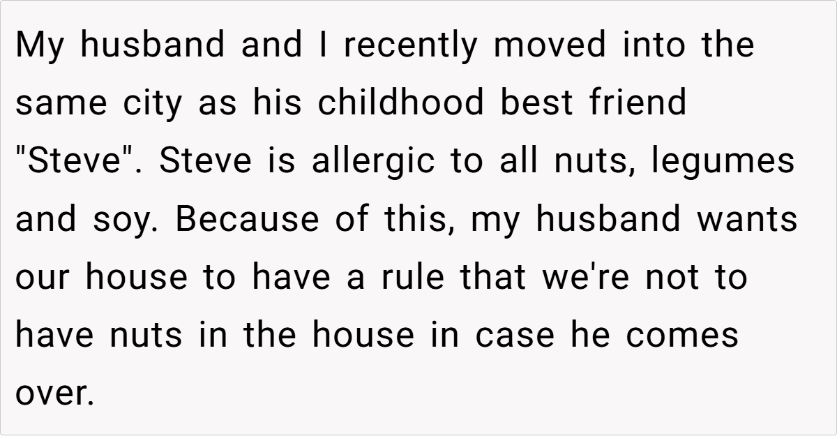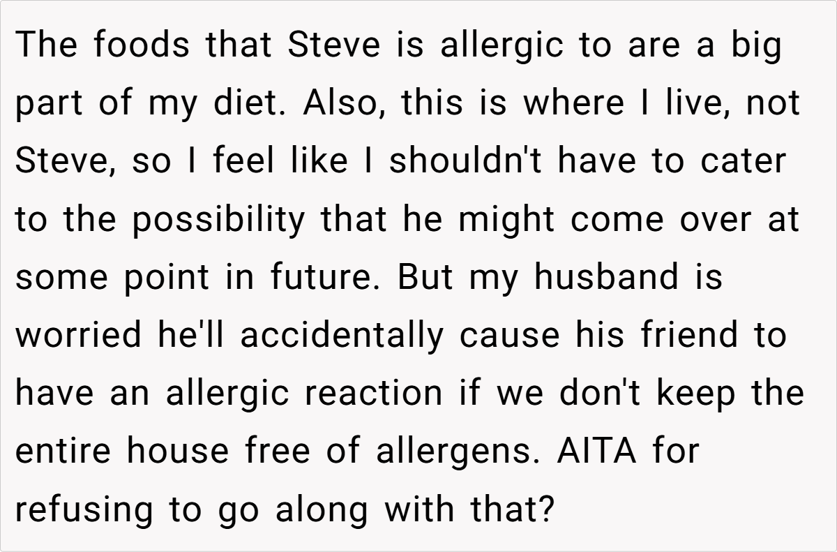 ‘AITA for refusing to remove certain foods from my house because my husband’s friend is allergic?’